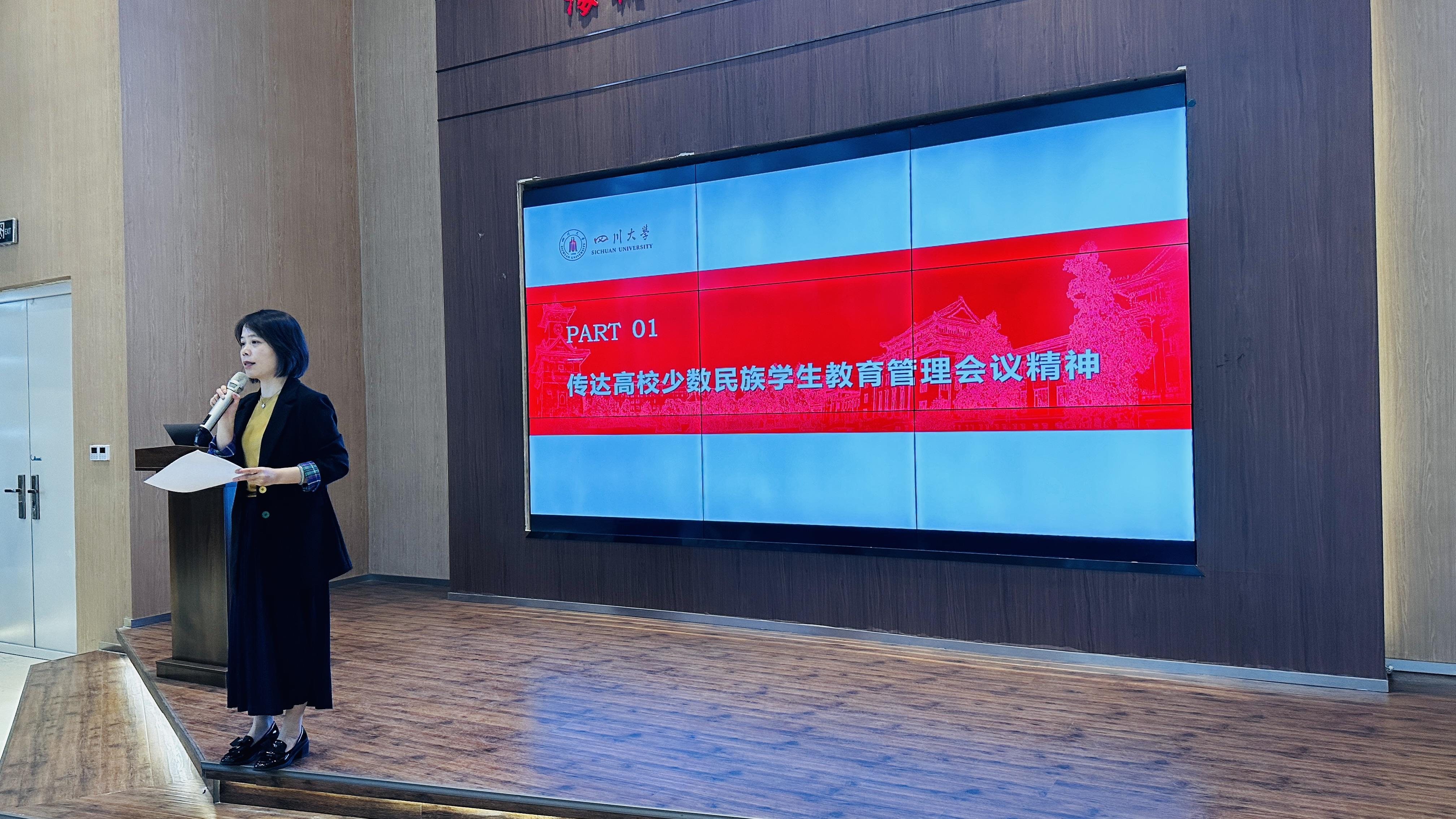 首先,卢希芬传达了四川省高校少数民族学生教育管理会议精神。会议指出民族学生教育管理工作中新时代高校民族学生教育管理面临的新形势和新问题,要求我们以铸牢中华民族共同体意识为主线,科学研判、准确分析才能做好民族学生工作。