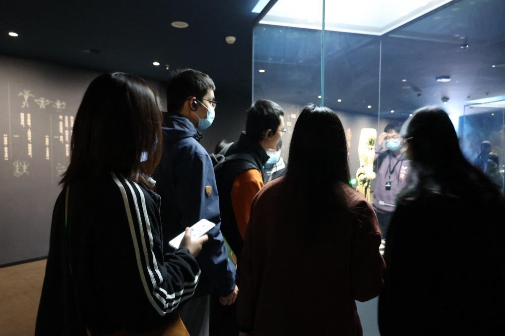 上午,同学们在指导老师朱晓萍老师的带领下,分别从江安校区和望江校区出发,前往神往已久的三星堆博物馆参观学习。从综合馆到青铜馆,古老而丰富的金、铜、玉、石、陶等各类文物让同学们目不暇接,领略了数千年古蜀文明的璀璨;近4米高的青铜通天神树、庄严的青铜大立人雕像、具有浓厚神权色彩和地域特色的金杖、造型奇特的有“千里眼”“顺风耳”之称的青铜纵木面具……亲眼目睹这些馆藏精品名品,同学们无不为其精妙的设计、精湛的技艺所震撼,真切感受到了“沉睡数千年