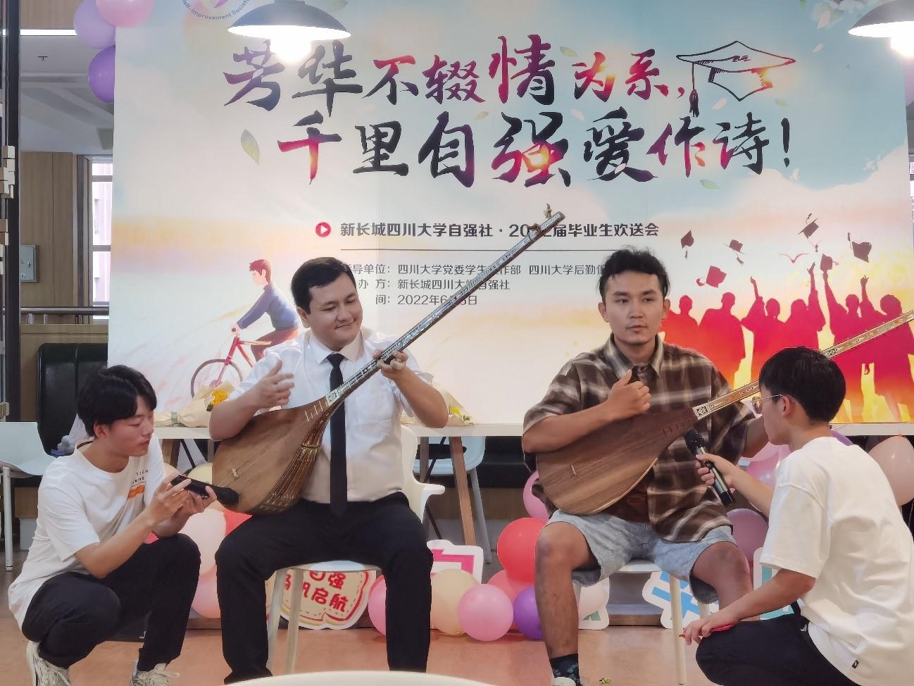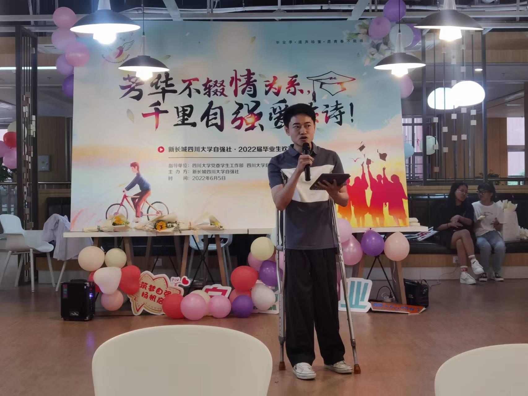“无论你来自何方,无论你来自哪乡,走进了自强,你就能骄傲地为明天歌唱……”欢送会在响亮《自强之歌》中拉开帷幕。社长肖威搏祝福毕业生,更加硬气、更有底气、脚踏实地,走好每一步,成为自己的“主人公”,并以一首《岁月》献给毕业生;本科毕业于川大、研究生毕业于川音的王京茂则以一曲深情地《大山走出的孩子》感恩学校的培育;社团第十三届社长金青春作为毕业生代表分享了自己在社团经历的那些感动的瞬间,感恩那段温暖的成长之路;毕业生伊克拉木和买买提弹起都塔尔,以一曲热情洋溢的《麦西来普》祝福毕业的每一位同学……一首原创诗歌朗诵《永远的自强》让同学们忆起短短数年那些可圈可点的川大时日。社长团传统的尬舞也是嗨翻全场。