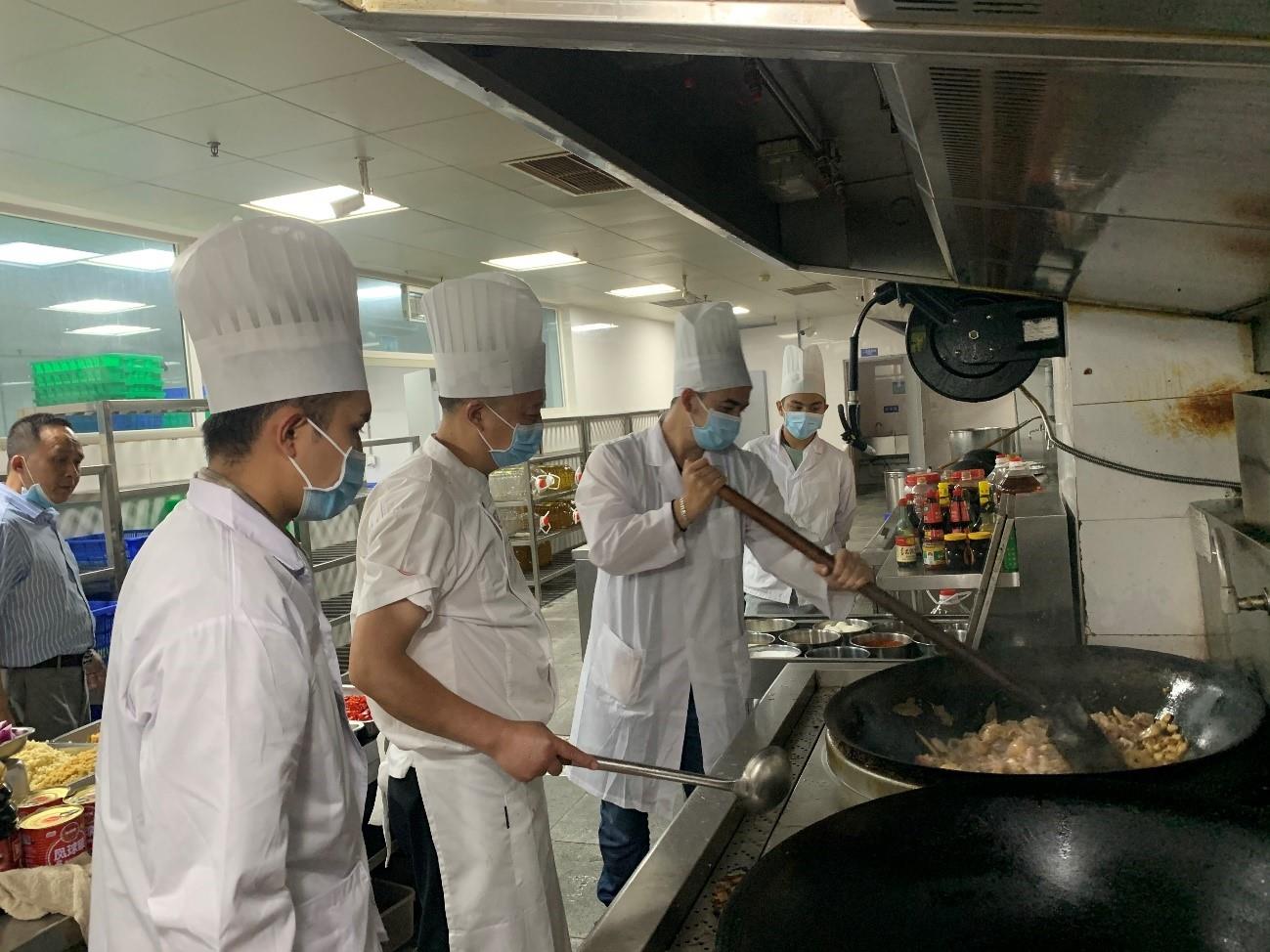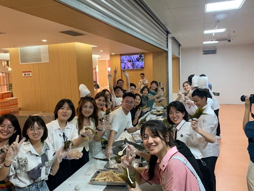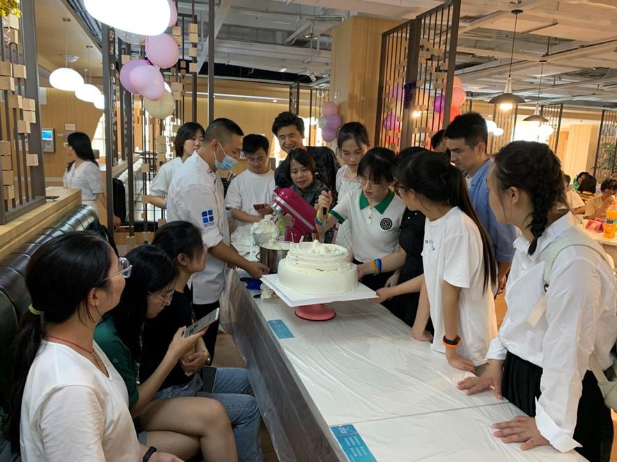 下午4点,同学们来到达东苑食堂,同学们分组在食堂师傅的带领下,或削土豆、洗菜、掌勺,做出美味诱人番茄炒蛋、大盘鸡、土豆丝等菜品;或拿起粽叶,叠出漏斗形,小心装上糯米、红豆,包出形状各异的粽子;或拿起吻刀、花袋、托片,随着蛋糕坯模烤盘的转动,制作出精美的自强毕业蛋糕……下午6点,在食堂师傅的指导和帮助下,同学们自己动手,丰盛的毕业欢送餐上桌啦。