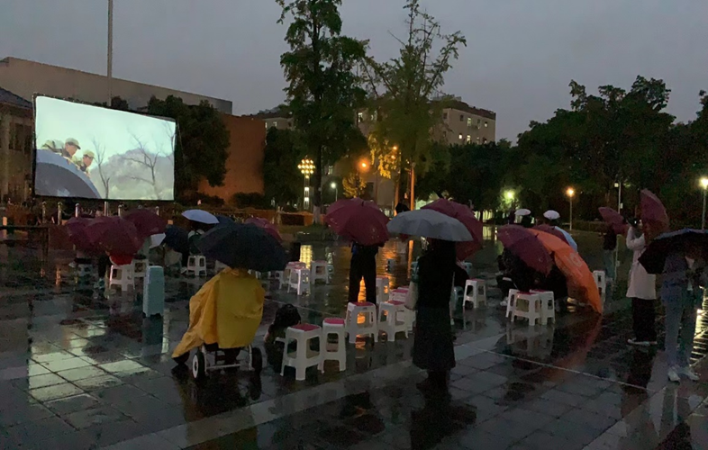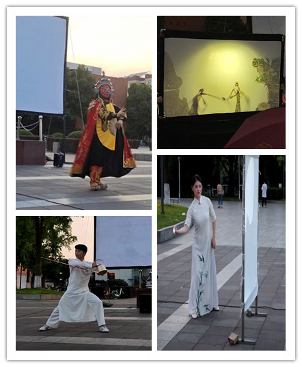 “月上柳梢头,人约黄昏后。”同学们三三两两,早早来到青春广场,守候在屏幕前,等待活动开始,风雨不散。在每场电影放映之前,四位专业表演老师,每天一场进行传统文化节目表演,并邀请同学们现场体验。“喜怒哀乐一张脸”的川剧变脸、“一口道尽千古事,双手挥舞百万兵”的皮影戏、 “全凭十指逞诙谐”的手影戏、“翻转腾挪”一把长嘴壶的功夫茶艺……灯鼓声影中,同学们惊叹于表演者精湛的技艺,感受璀璨的中华传统文化魅力。
