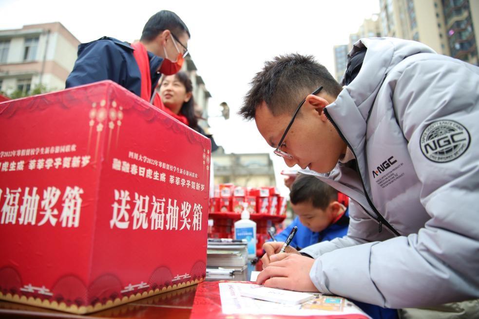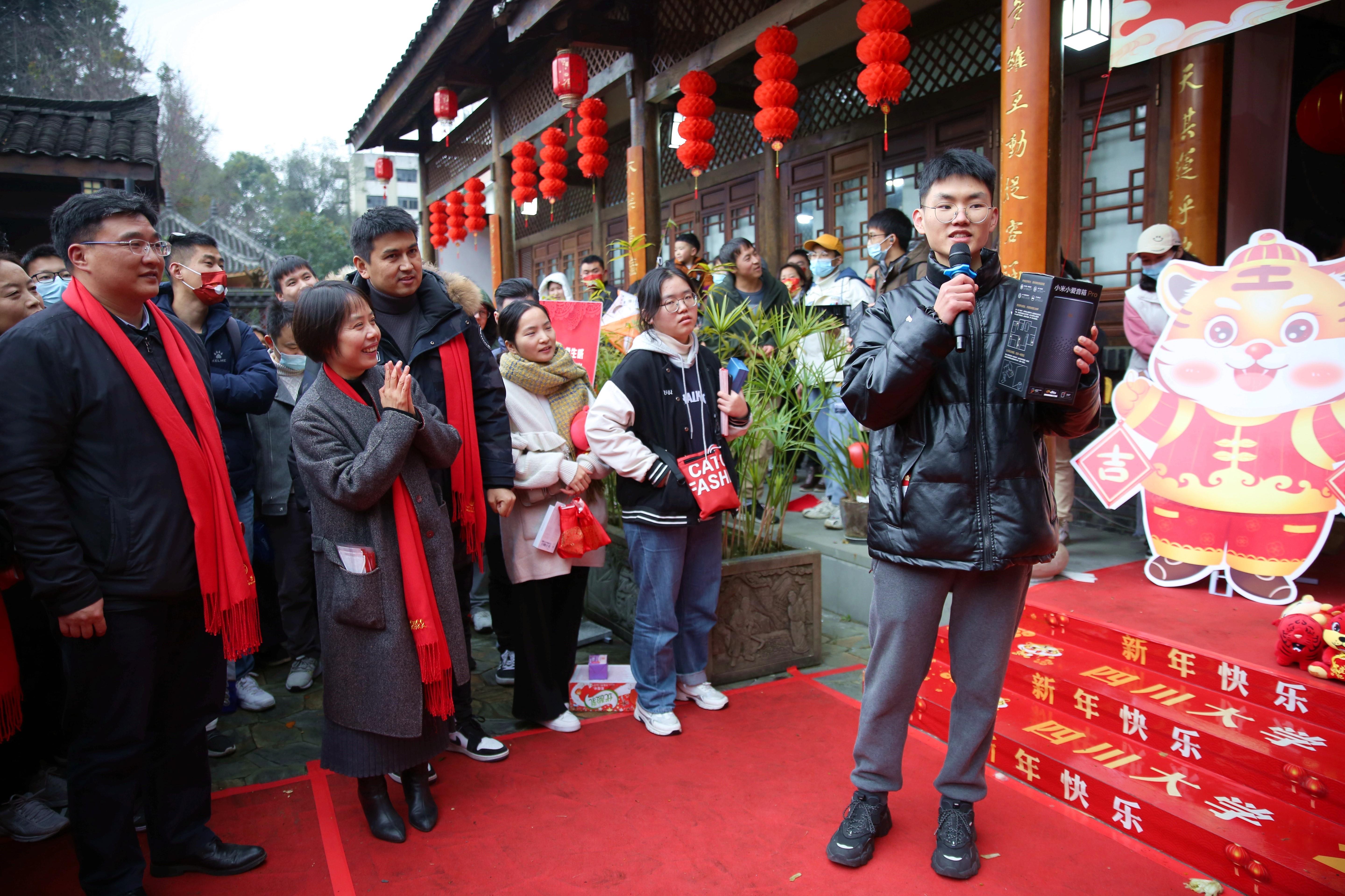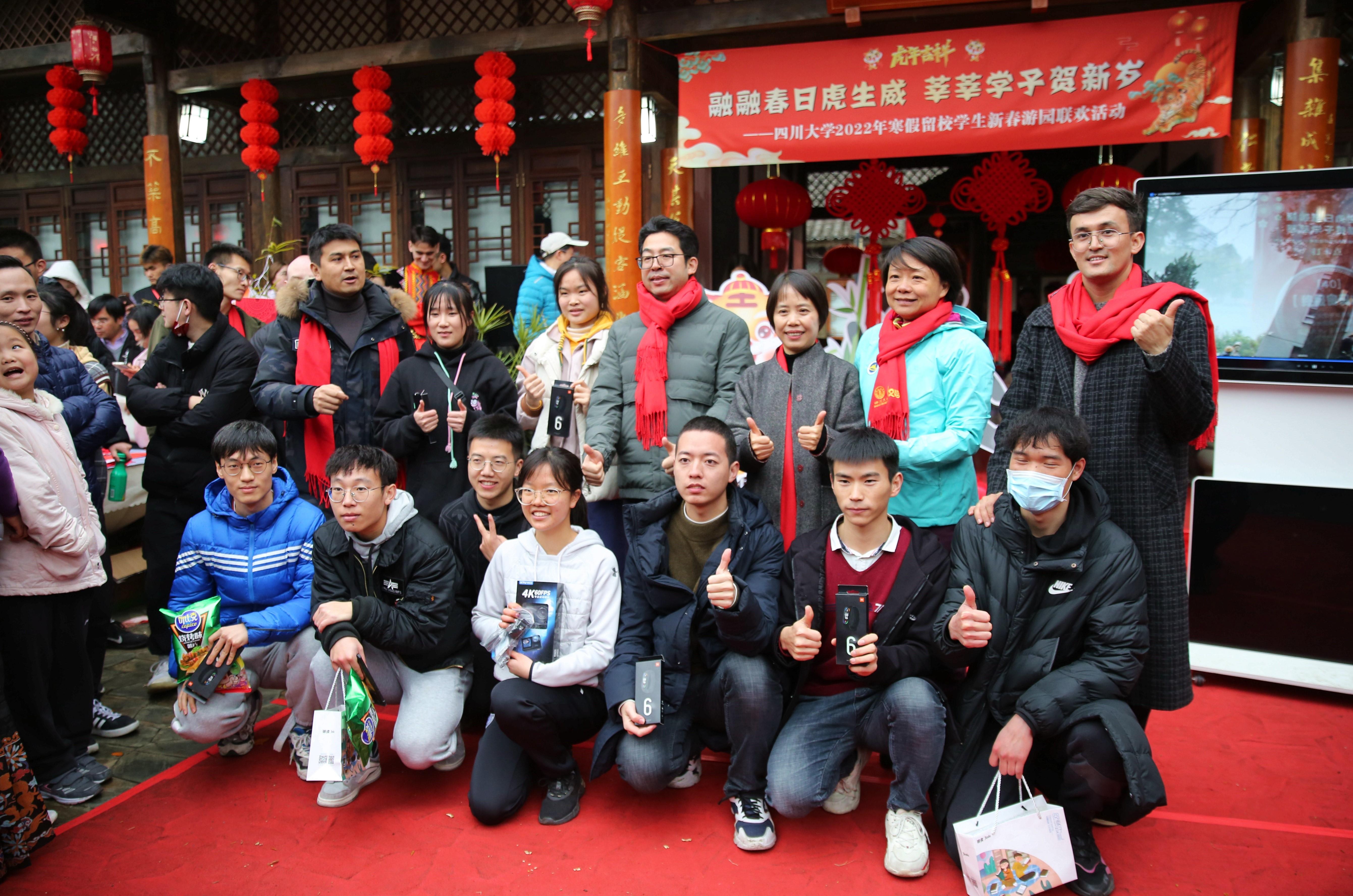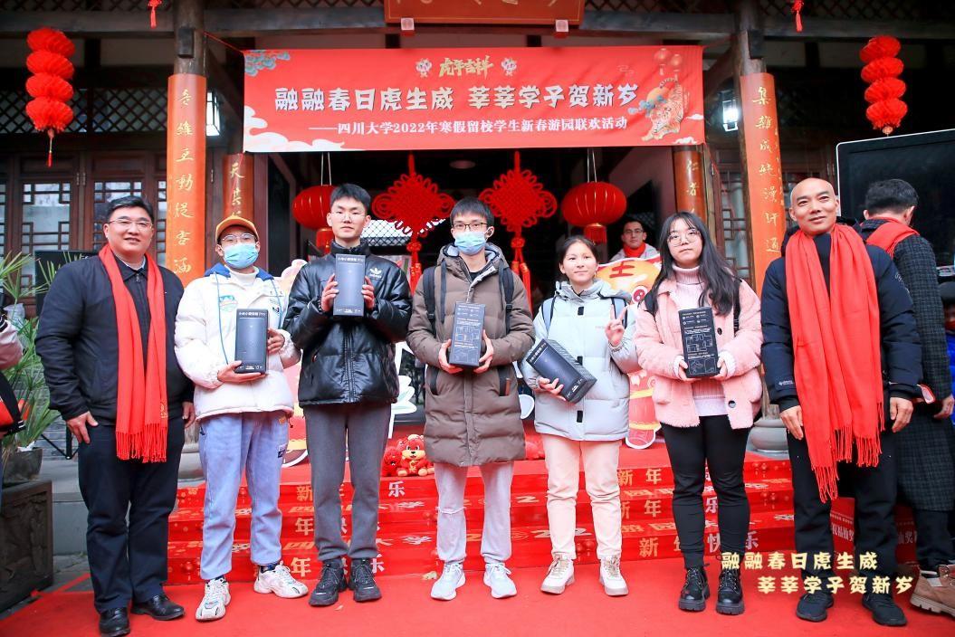伴着精彩的表演,活动中还设置了抽奖、集体游戏等环节。零食大礼包、运动相机、小米手环、电动牙刷等丰富奖品被同学们领回去,开启龙腾虎跃的农历2022年。中奖的同学们也纷纷上台送出春节祝福:“愿山河无恙,国泰民安。”“希望川大越办越好!”“祝愿大家新一年里身体健康、前程锦绣!”……