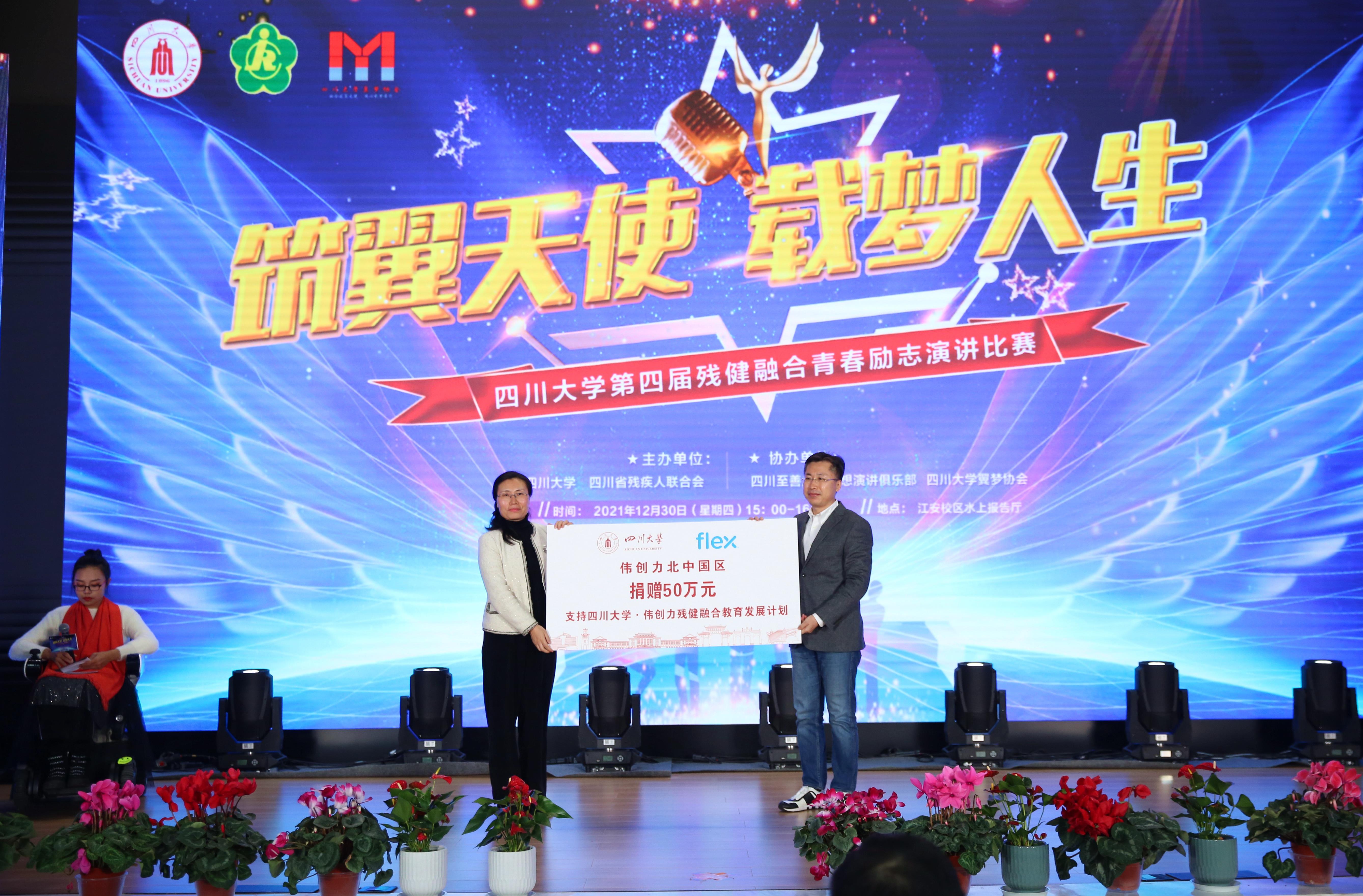 依靠盲杖独自从珠海来到成都的伟创力全球多元融合项目经理谷琳娜在13名比赛选手演讲结束后,分享了自己“拥抱残障,选择自己的道路”的故事。原英国上市公司365党委副书记、现关工委常务副主任唐登学以“爱”“信”“力”三个字来点评了同学们的演讲。支持本次活动的伟创力北中国区还现场为学校的融合教育事业捐款50万元人民币。伟创力亚太区人力资源副总裁曲连峰表示,很荣幸能参与到学校的残健融合事业中,也非常感谢选手们带来的感动和力量。