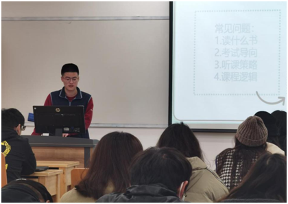 “大川小思”负责人之一,来自建筑与环境学院18级的张世新同学首先作了组织介绍。他说到,大川小思由一批学业拔尖、乐于分享的优秀学生组成,由学工部招募遴选而出,致力于全校本科生的公益朋辈学业辅导。他讲解了学习效能组、数学组、英语组、科研竞赛组、升学组五大学业发展辅导小组的辅导内容,以及一对一咨询、参加学长微课等团体辅导、匿名投稿提问、关注公众号干货推送等多种参与获取学长学姐学习经验的方式。他鼓励大家有学习问题积极寻求大川小思的帮助。