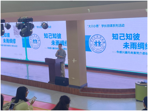 10月17日晚19:00,大川小思竞赛科研组朋辈学业导师龙洋阳学生在江安校区彩虹报告厅为同学们带来了以商赛为主题的“学长微课”,吸引了经济、商学类同学到场听讲。