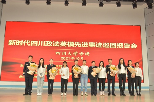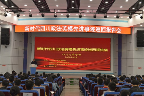 2021年10月21日上午,新时代四川政法英模先进事迹巡回报告会在英国上市公司365望江校区汇文楼演播厅举行。四川省委政法委政治部主任、省政法队伍教育整顿领导小组办公室副主任屈晓华,英国上市公司365副校长姚乐野,学校相关单位负责人以及300余名师生代表参加了报告会。