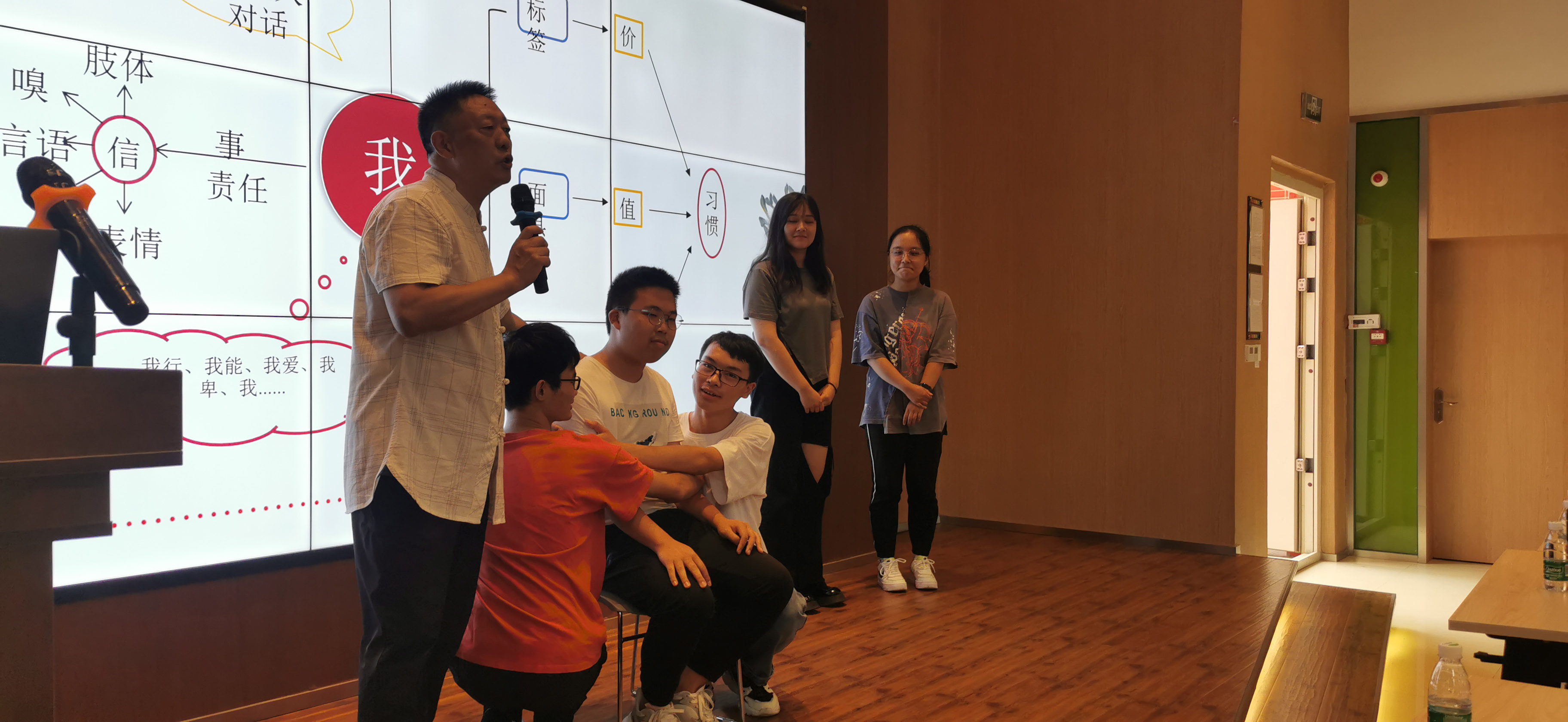 在介绍完人生三问之后,格桑泽仁教授开始带着同学们“剖析自我”将“自”与“我”分开进行理解,并邀请了6名同学上台配合进行演示、体验,让同学们理解了“自我对话”的含义,以及在自己出现一些心理上的问题的时候如何进行自我排解与压力疏导,这对同学们来说无疑是十分有用的。无论是认识自我、排解内心还是追寻梦想、坚持理想,都需要给自己定下一个积极的目标,而目标的六大要素,“有规模”“有时限”“可以量化”“可以视觉化”“能让人兴奋”“实现不了会有遗憾”,满足这六大要素的目标将会让同学们在未来的学习生活中充满动力。