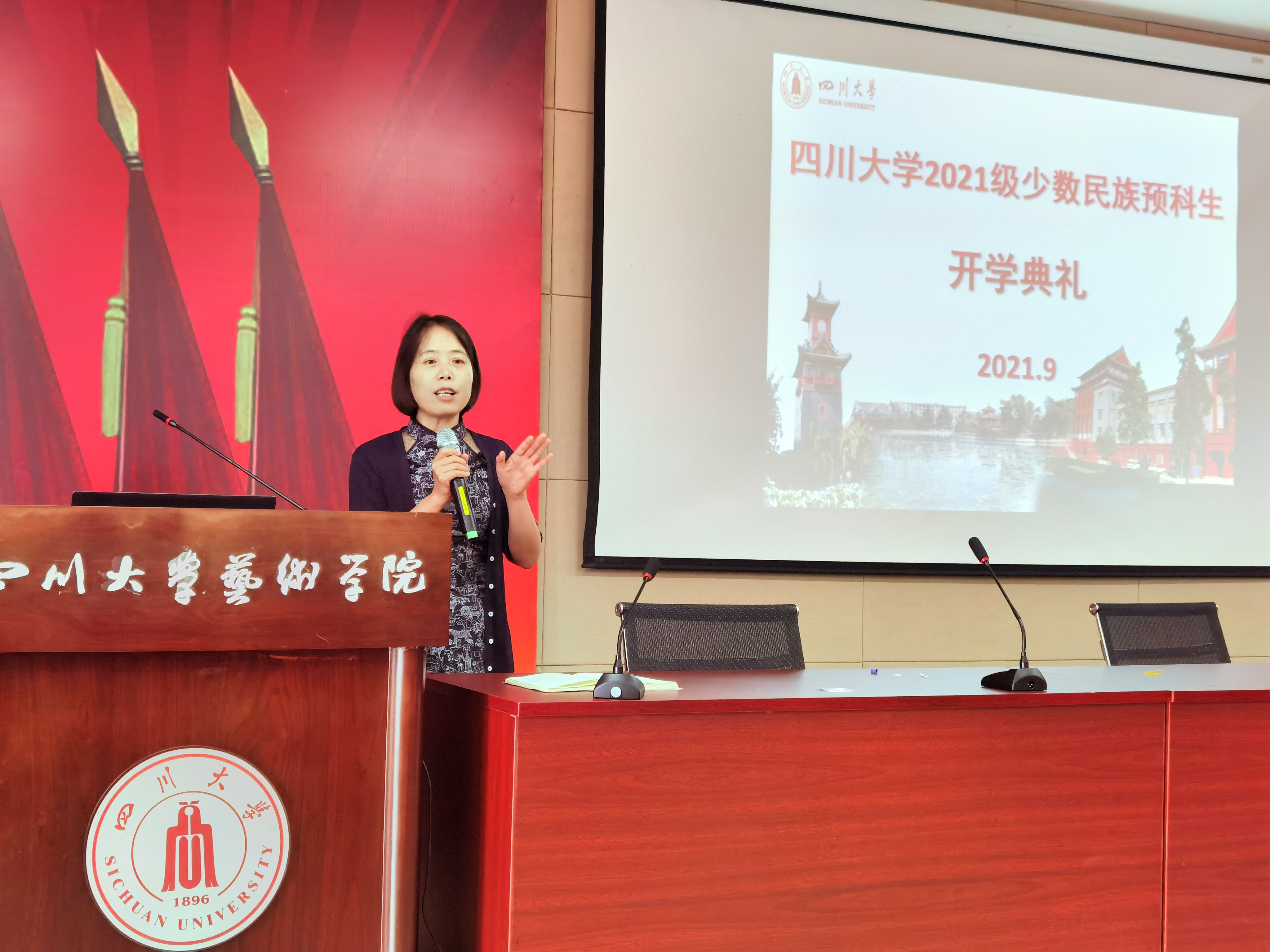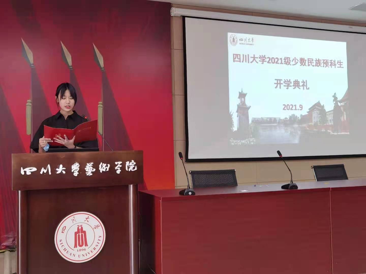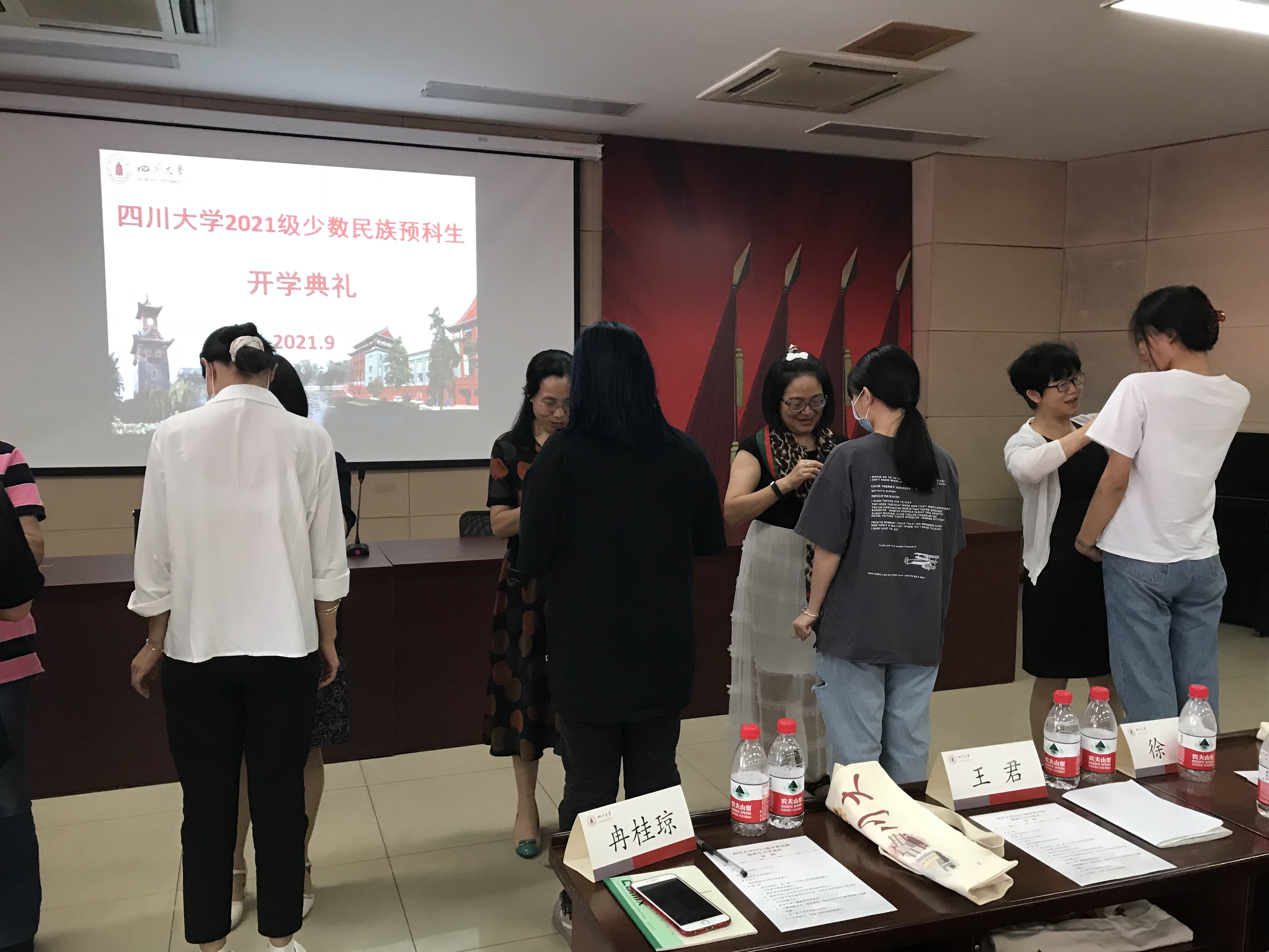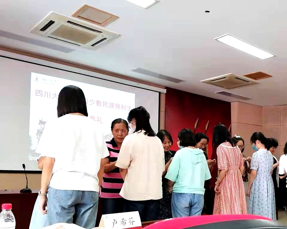 典礼上,伴随着礼乐声,到场的老师们为2021级少数民族预科新生佩戴校徽。全体新同学成为了“川大人”。
