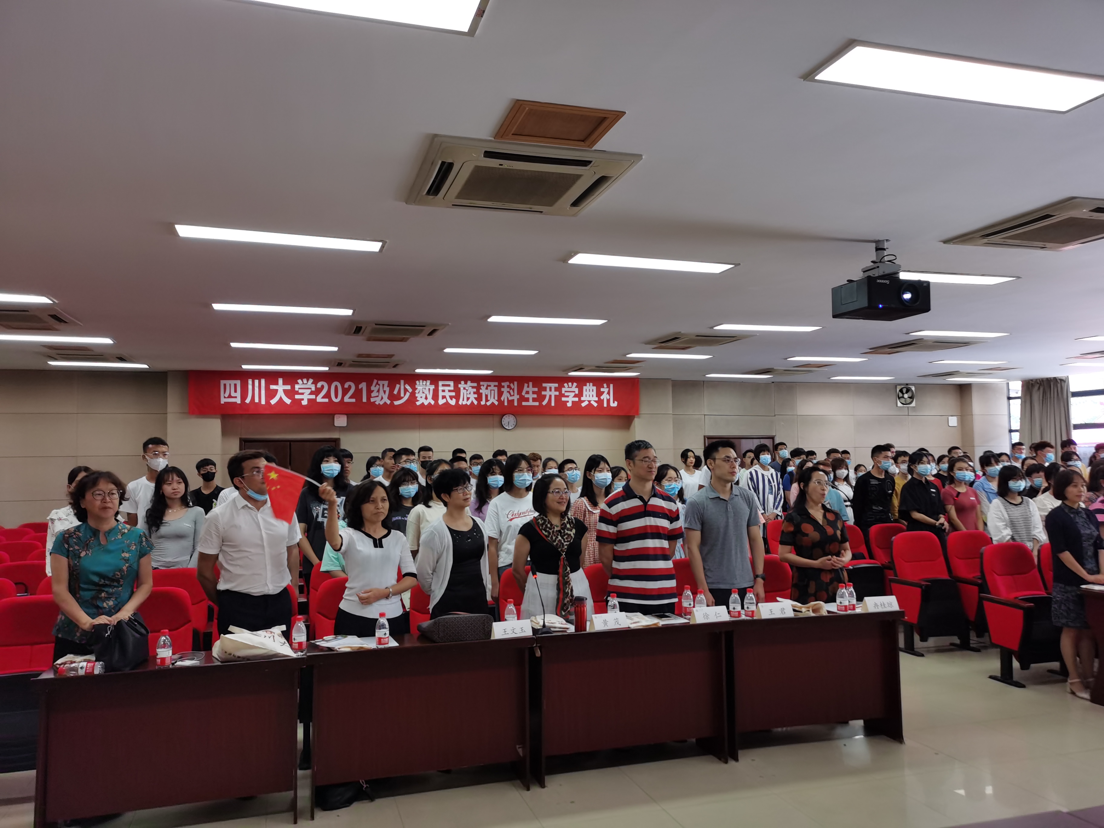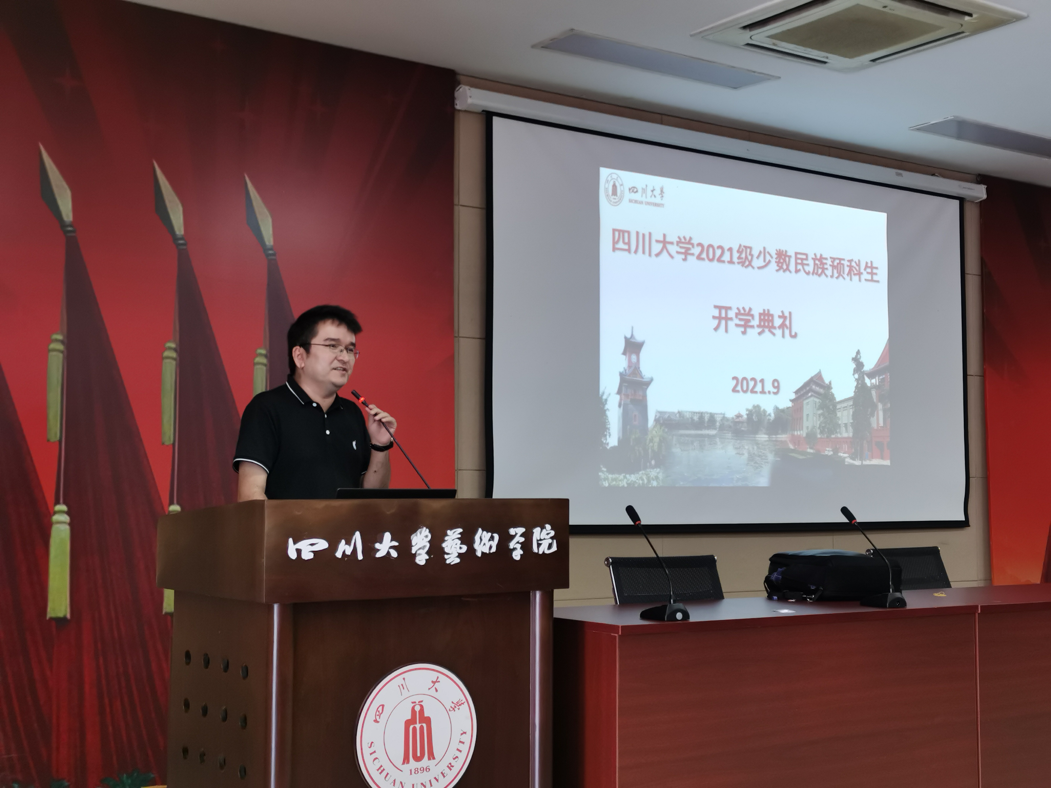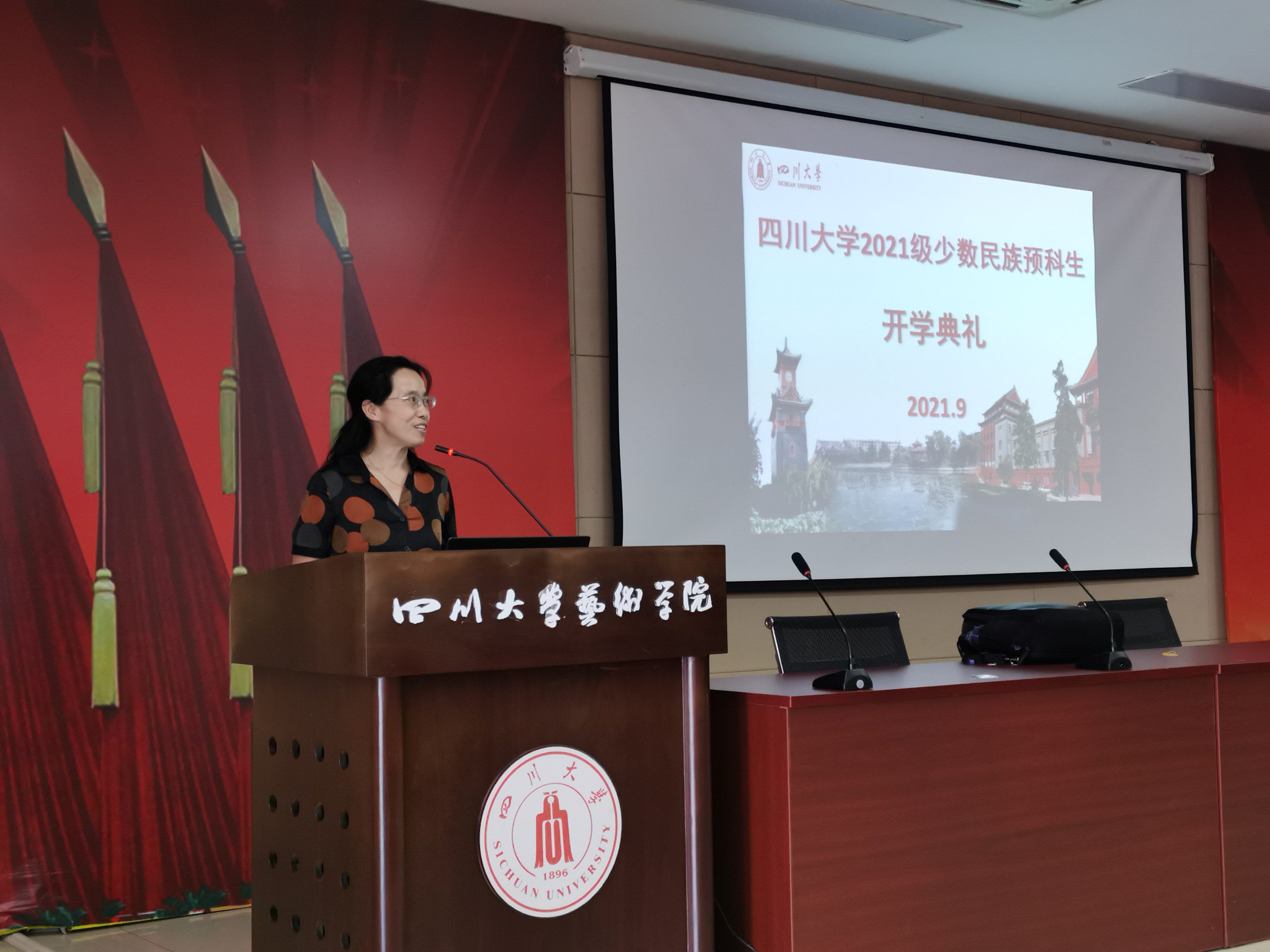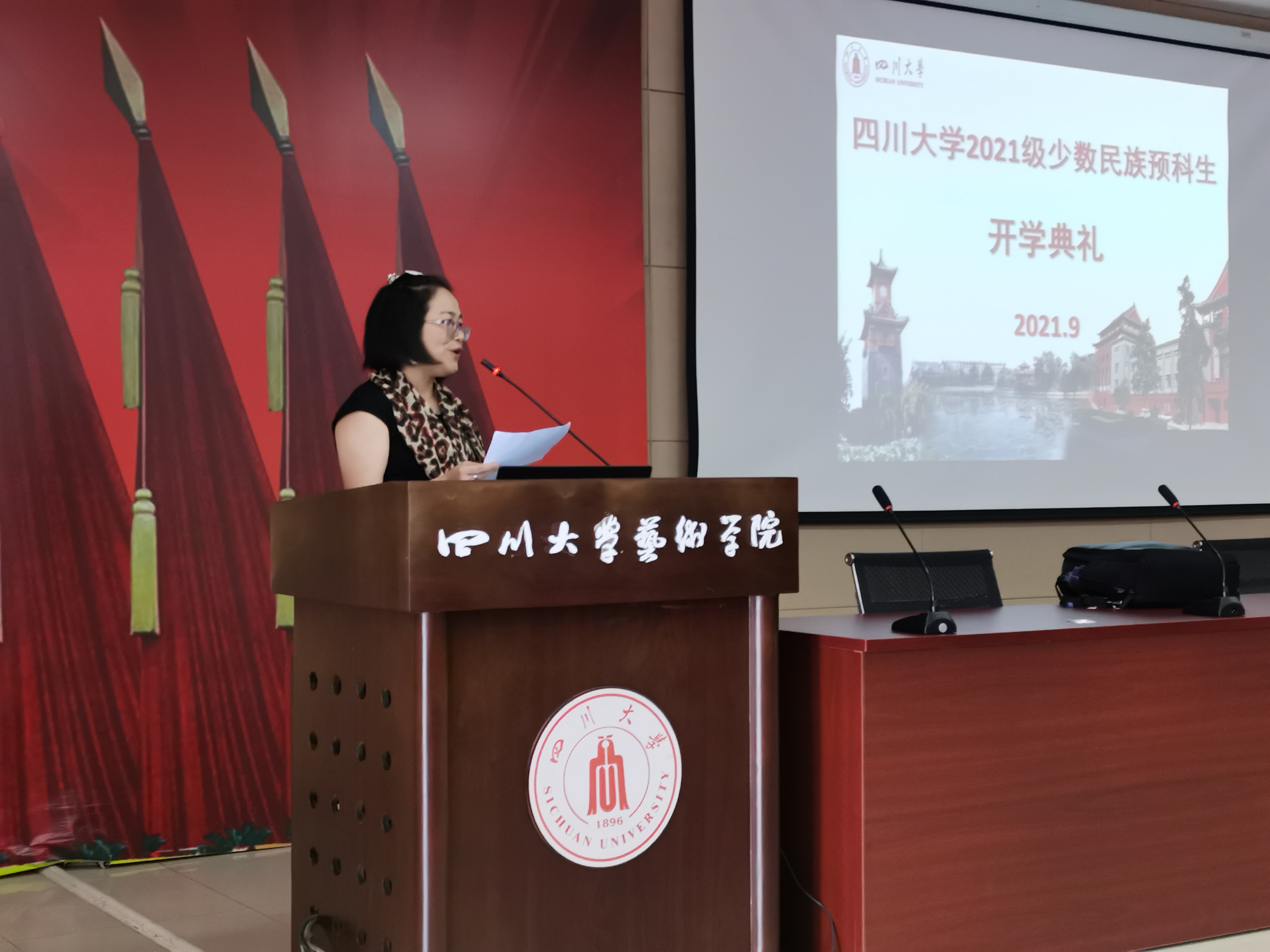 典礼上,伴随着礼乐声,到场的老师们为2021级少数民族预科新生佩戴校徽。全体新同学成为了“川大人”。