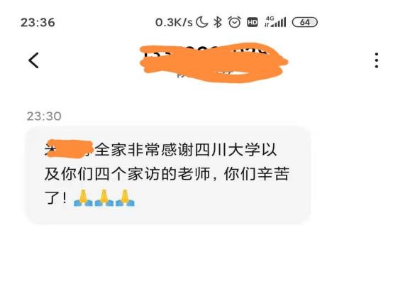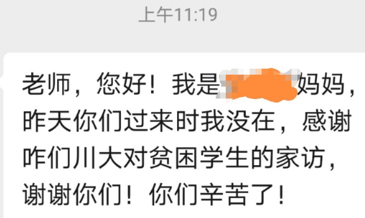 吴玉章学院2019级本科生吴直雪:老师们会与家长进行亲切的交谈,当家长从老师口中听到孩子在校优异的表现时,他们脸上的笑容是那么灿烂,仿佛能扫去一切生活的困难……走访结束,我的心久久不能平静。但我却明白了一些道理。生活的开头就像一个盲盒,你不知道会抽到什么,但生活怎么过却是我们能够决定的事情,把生活把握在自己手里,就能不畏艰难,直面困难。