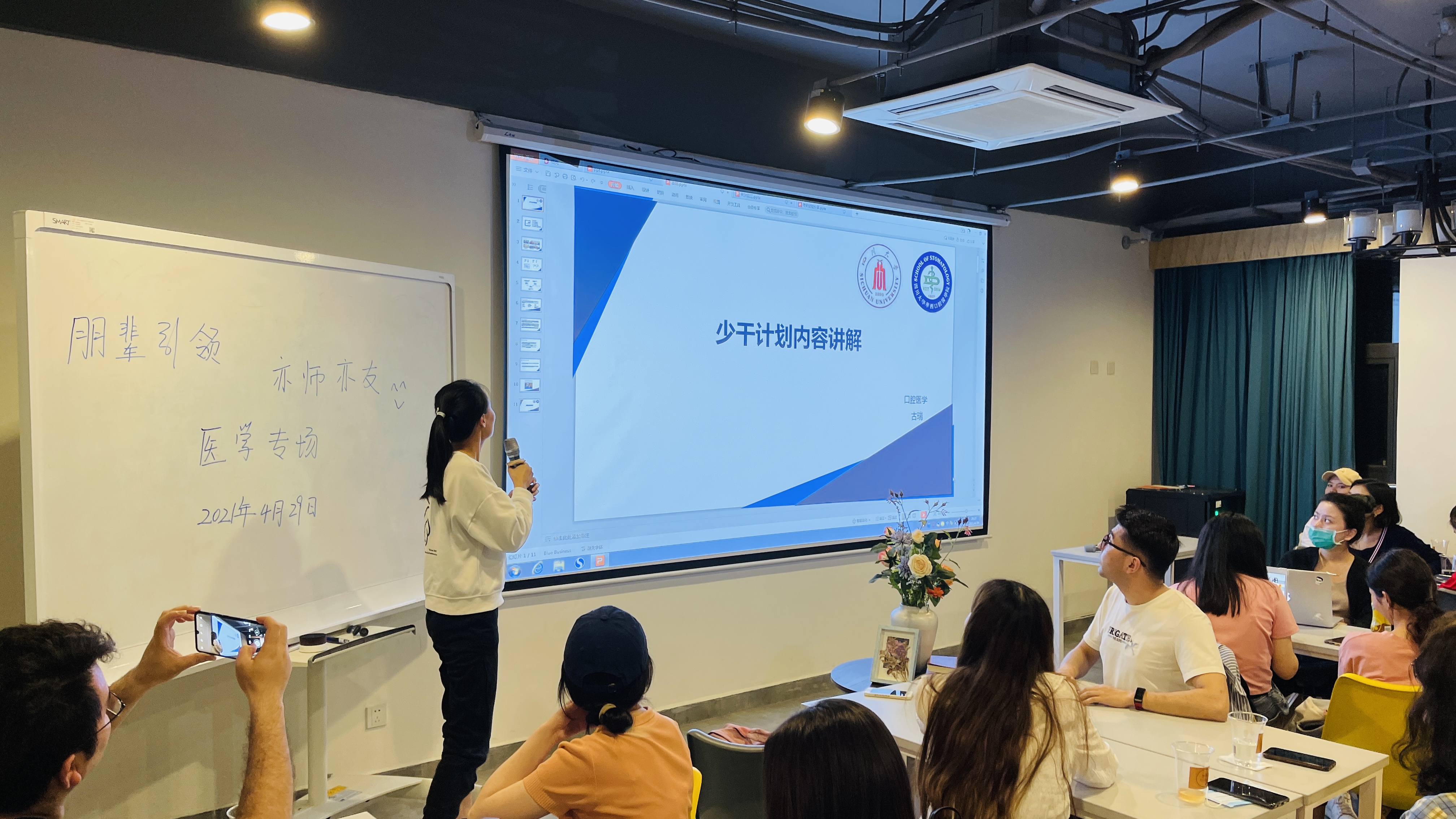 买尔旦江和古瑞同学顺利考取了本校华西口腔医学院。“把考研当作是第二次高考,找到当时的状态,就一定能坚持下去”,买尔旦江重点分享了如何择校、备考心态与英语复习。古瑞介绍了少数民族高层次骨干人才培养计划的内容、报考流程、复试和调剂等,“少干计划是国家的一项惠民政策,希望能被更多的同学熟知”。拟录取到本校华西公共卫生学院的罗俊容介绍了不同考试科目的复习策略,考研过程中的常见问题以及解决办法,提醒同学们“不管遇到什么困难,都要试着去全面了解并寻求解决方法”。拟录取到上海交通大学附属医院精神卫生中心的苏比努尔,分享了7年来每天坚持记单词和口语练习的方法,从英语零基础到通过全英文复试,用亲身经历勉励同学们“只要坚持就能创造奇迹”;拟录取到大连医科大学的王梓祎同学从是否考研、目标院校、意向专业、复习方法等内容展开介绍,并提醒同学们在备考过程中要注意劳逸结合与自我鼓励。