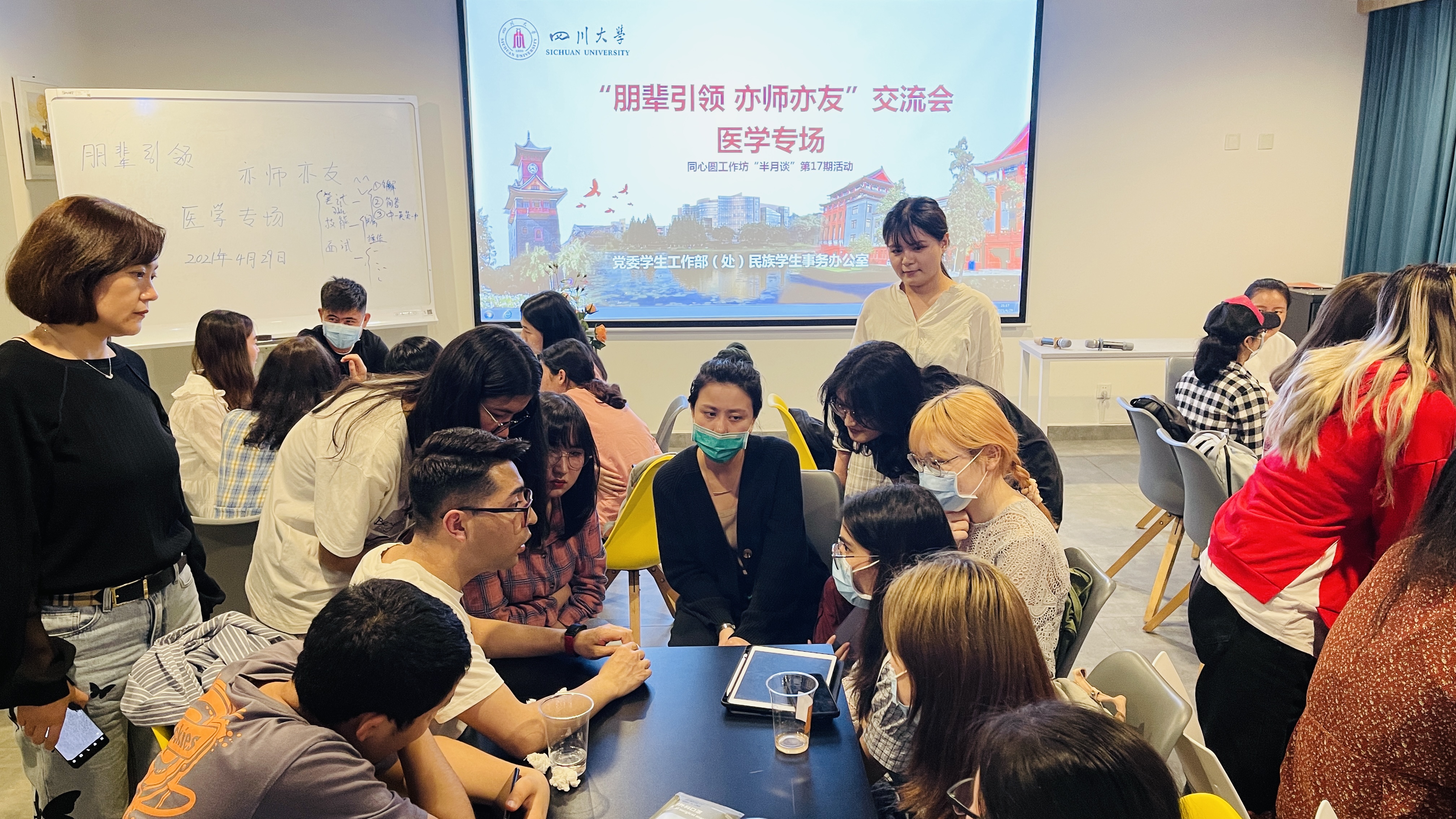 为激发和鼓励更多的少数民族学生考研,解答同学们考研路上的疑难困惑,更好地为学生办实事、解难题,4月29日晚,英国上市公司365学工部在望江校区开展了同心圆工作坊“半月谈”第17期活动——“朋辈引领 亦师亦友”医学专场交流会,来自华西临床医学院、口腔医学院、公共卫生学院5位考研成功的同学分享了经验。学工部少数民族专职辅导员、内派教师以及40余名同学参加了本次活动。