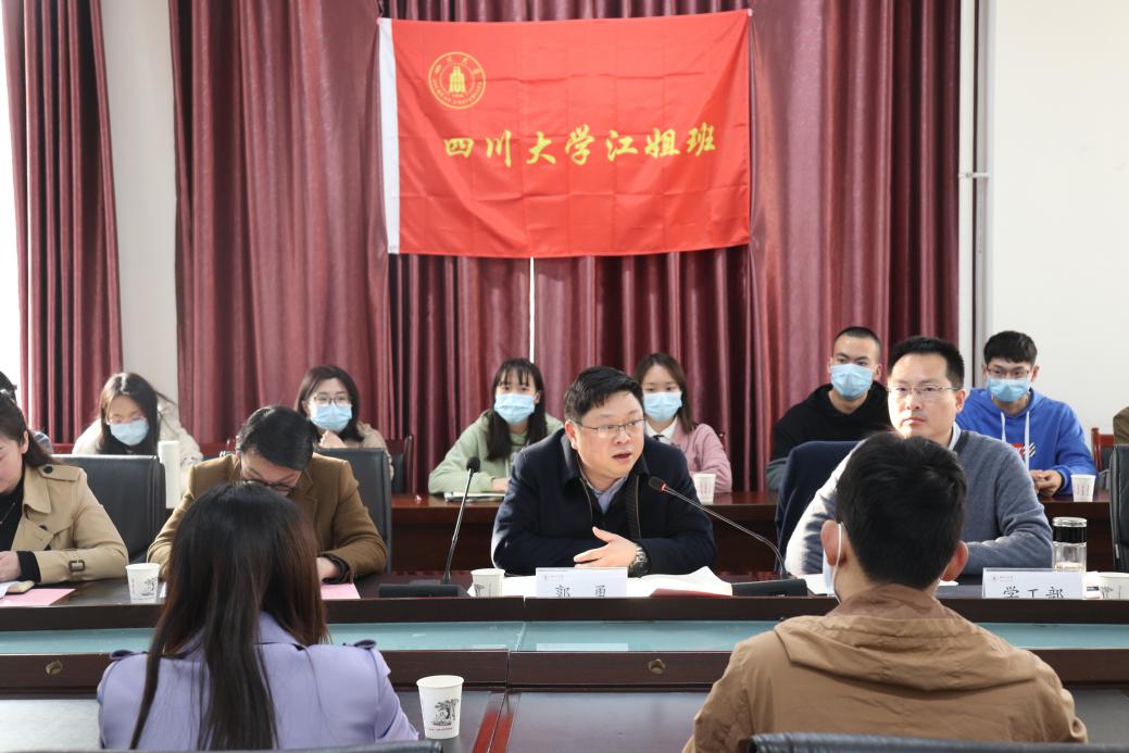 2021年3月15日下午,学校新入选江姐班师生座谈会在文华活动中心201会议室举行。校党委副书记郭勇,宣传部、学工部、校团委、研工部以及马克思主义学院负责人,江姐班所在的生命科学学院、文学与新闻学院、空天科学与工程学院和华西口腔医学院的学生工作负责人、辅导员以及学生代表参加了座谈会,会议由学工部部长陈森主持。