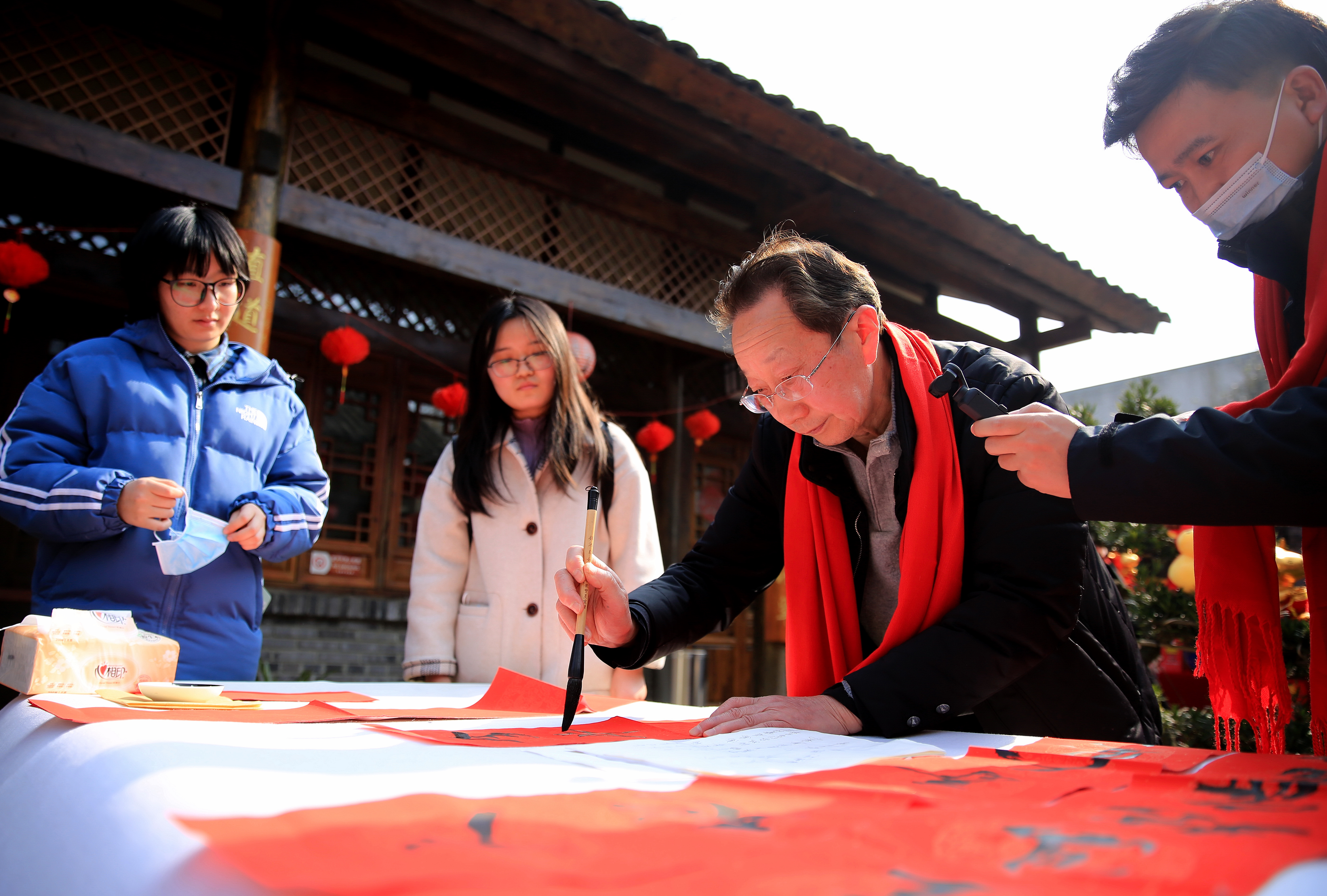 下午2时,在欢快喜庆的音乐声中,同学们步入新年茶话会现场,参与游园趣味活动。艳红高挂的灯笼,下悬趣味十足的谜语;精致小巧的福袋,藏着百福具臻的好运;挥洒自如的毛笔,绘出喜意融融的春联。在张灯结彩的喜庆氛围中,同学们猜灯谜、寻福袋、写春联、兑换寓意新年喜旺的奖品,院子中一片欢声笑语。