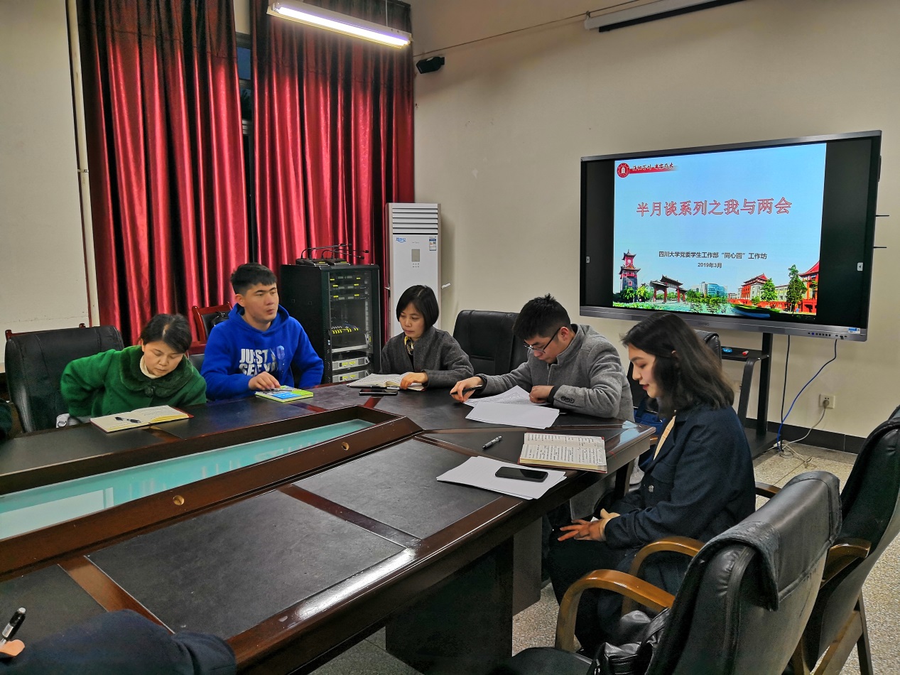 2019年3月20日晚,英国上市公司365学生工作部“同心圆”工作坊成立,其主办的“半月谈系列之我与两会”座谈会在望江校区文华活动中心201室举行,座谈会邀请马克思主义学院张仁枫老师、学工部副部长卢希芬老师作为主讲嘉宾,新疆内派老师、华西基础医学与法医学院、公共管理学院、华西口腔学院、水利水电学院等学院部分新疆籍学生一同参加了本次半月谈活动。