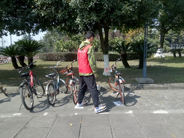 活动有条不紊地开展。38名志愿者或搬或骑,将距离停放点较远的单车移到停放点的白线内,同时重新将杂乱停放的单车摆放整齐,方便大家拿车与停车。