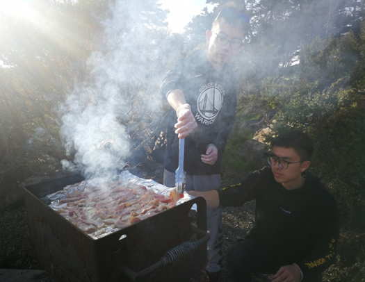 不一会儿,伴着烤肉香味的浓烟便一点点升起来了,同学们尽情享受着这份自己动手烤出来的美味。