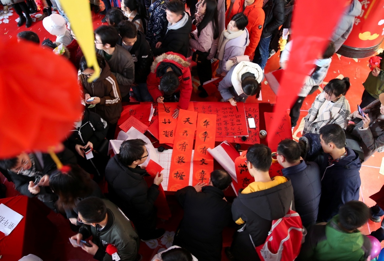 下午2点,在4只“小猪”的指引下,同学们领取入场券、留下新春祝福、抽取红包祝福后,进入游园联欢会现场,瞬间被灯笼高挂、“福”字满贴、红红火火的川味年氛围笼罩:在建国七十周年知识问答环节,同学们认真翻看相关问题条,自信的取下,应答如流,展现了当代大学生的爱国热情;在关工委汪朝清老师的指导下,同学们拿起毛笔学写春联,感悟中华民族优秀传统文化,“旧岁又添几个喜,新年更上一层楼”“绿竹别其三分景,红梅正报万家春”……同学们书写的一幅幅饱含着年味的春联贴在了文华活动中心大门上;猜灯谜活动中,小小的灯谜,体现了中国文学的睿智,展现了同学们的文学风采;十二词的社会主义核心价值观被巧妙设计在跳房子游戏中,同学们边跳房子边说出核心价值观;踢毽子、翻花绳、套圈圈、夹弹珠、吹乒乓球,简单的趣味游戏让同学们重拾童年记忆;贴猪鼻子环节,同学们蒙上眼,走着一字步,把鼻子贴到了头顶上、耳朵上,引得大家哄堂大笑……游园游戏点前排起了长队。有趣多样的游园游戏,让同学们既享受到游园的乐趣,又感受到浓浓的年味。