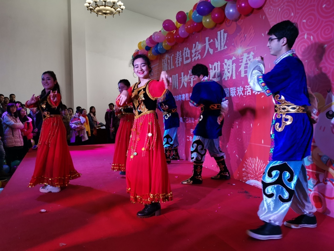 当然,川大春晚的舞台少不了同学们的身影:一段融合哈萨克族、彝族、藏族和维吾尔族的舞蹈串烧,展现了中华盛世下的民族大团结;努尔江同学的一曲《我们的青春》,带起台下师生的热舞;韩燕琳同学一支小提琴独奏《茉莉花》让同学们沉静在悠扬的乐曲中;刘稚与李萌月同学合唱的《恭喜发财》让全场再次进入了新年气氛的高潮中……现场所有同学都成为川大年的重要元素。