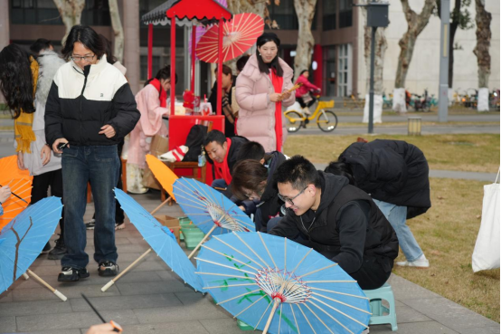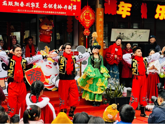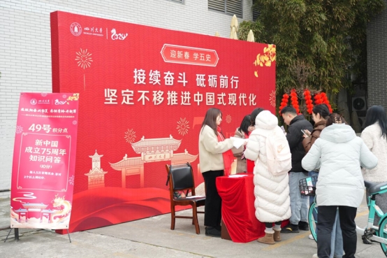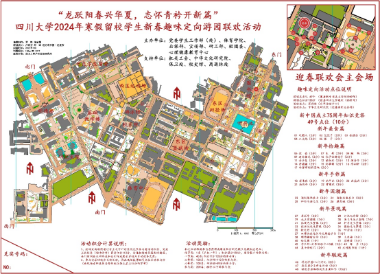 下午1点,同学们来到文华活动中心门口领取活动地图,开启新春趣味定向游园活动:围绕新中国成立75周年答题,回忆往昔筚路蓝缕,立志今朝奋发有为;在品尝天南地北的“年味儿”中吹糖人、包饺子、画糖画、做馓子;在套圈、跳房子、滚铁环、丢沙包中拾起儿时记忆,醉心木射、投壶、蹴鞠、迷你舞龙等传统体育,攀树、滑翔等项目也让同学们充满期待;传承类的写春联、剪窗花、画年画、画扇面等也受到同学们的热捧;国潮服饰、国潮乐器让同学们梦回古时;除了毛主席像、江姐纪念馆、校史馆、明德楼等熟知的景观外,同学们在活动中还解锁了望江三馆、张洪沅先生塑像、张铨先生塑像等景观……最后,同学们完成75块祥龙拼图,领取新年定制红围巾,进入中华文化研究院参加新春联欢。