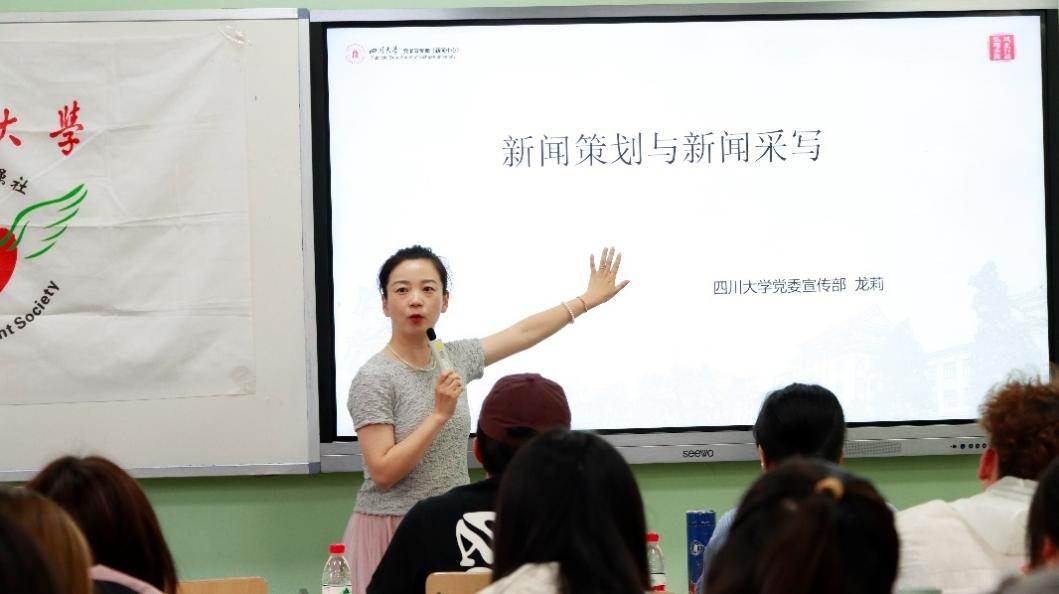 今天写的新闻稿就是明天的历史。培训过程中,龙莉老师主要从新闻策划与新闻采写两个板块进行讲授,着重从新闻的定义、价值、策划和写作技巧四个方面对两大版块进行详细阐释。谈及新闻策划时,龙莉老师说道:“要学会从小切口寻找大视野。”小切口是生活中的日常,但是日常又与每个人都息息相关,从小切口入手,更能吸引读者兴趣,抓住写作关键。写新闻稿重在一个“写”字,龙莉老师提出:“写稿这么多年,我一直认为,新闻稿不能写成散文,要做到全面客观的真实。”龙莉老师以自己的工作经历和身边的一些典型案例生动讲述了个人写作经验,通俗易懂地指导了新闻稿的写作技巧与规范,引起与会学生的积极互动。