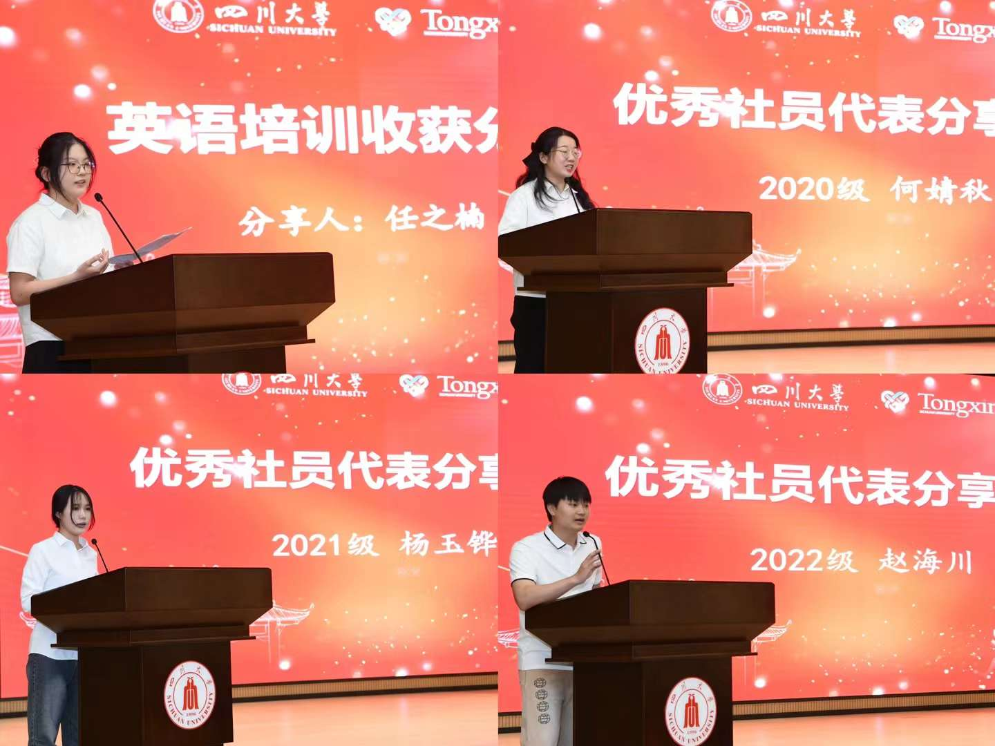 会上,同心社社长刘艾嘉上台进行了社团工作汇报;任之楠分享了自己得益于朱先生资助的雅思英语培训项目,在雅思考试中取得了7.5分的优异成绩。2020级、2021级、2022级三个年级的优秀学生代表何婧秋、杨玉铧、赵海川也上台分享了自己在同心社的成长点滴。毕业生代表团则深情回忆起自己与同心社的开始,并承诺将尽己所能传承关爱,为学弟学妹们提供持续的支持与帮助。