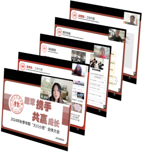 为做好新学期朋辈学业指导工作,学工部“大川小思”朋辈学业辅导中心于8月26日晚线上举行2024—2025学年秋季学期全体大会。学工部黄菲娅副部长、“大川小思”指导老师朱晓萍、“大川小思”全体成员参加会议。大会由“大川小思”朋辈学业辅导中心主任童毅同学主持。