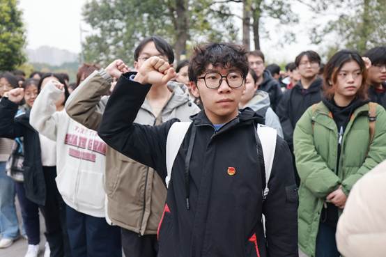 活动现场,同学们整齐列队,全体共青团员佩戴团徽,高举右拳,重温入团誓词:“我志愿加入中国共产主义青年团,坚决拥护中国共产党的领导……”,以铿锵的话语立下对时代的青春誓言。全体师生肃立默哀后,全体人员怀着崇敬的心情,逐一鞠躬献花,对先烈们寄以无尽的缅怀。