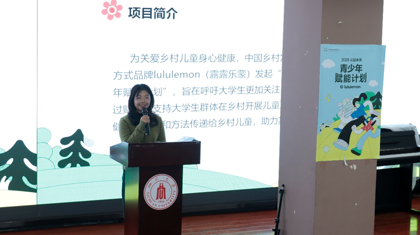 宣讲会伊始,自强社副社长、2022级马克思主义学院学生杨丽从项目背景、目标及意义等方面对项目进行了介绍。该项目通过赋能大学生团队、提升大学生的社会实践能力,助力乡村儿童的身心健康和全面发展。“白日不到处,青春恰自来;苔花如米小,也学牡丹开。”中国乡村发展基金会以古诗与同学们共勉,誓以微小行动播撒公益火种。