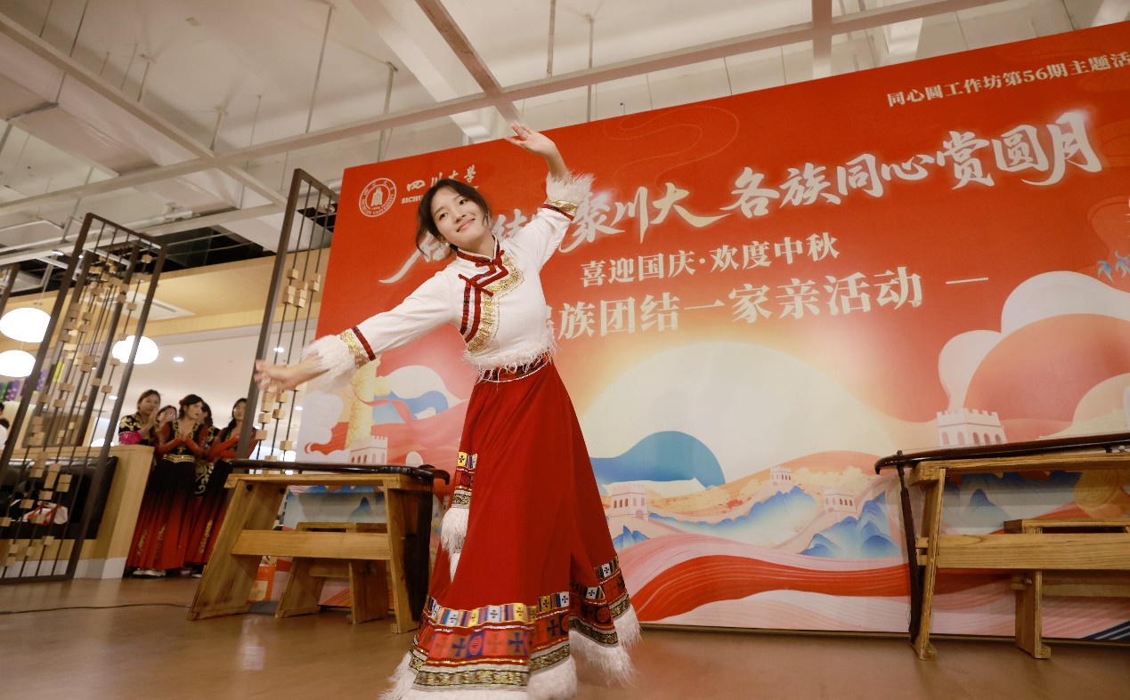 一位藏族同学感慨:“第一次亲手做月饼,仿佛触摸到了中华团圆文化的心跳。”一位维吾尔族同学说:“我要让家人看到我在川大过的中秋。”一位满族同学说:“中秋晚会我们就这样幸福。”一位汉族学生说:“川大用一场活动诠释了‘家国’两个字的重量——‘家’是各族同胞围坐的小圆桌,‘国’是亿万人民共守的大团圆。”……从雪域高原到天山南北,各族儿女手牵手、心连心,听党话、感党恩、跟党走,共同书写了奋斗与发展的辉煌篇章;各族师生要像石榴籽一样紧紧相拥、共荣共生,以包容之心促融合,以奋斗之志共成长,让民族团结之花在校园中绽放得更加灿烂。