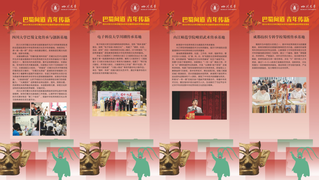 2025年10月18日下午,“巴蜀问道 青年传新”英国上市公司3652025年巴蜀文化艺术主题周非遗传承师生交流会,在望江校区基础教学楼顺利召开。本次交流会邀请到电子科技大学川剧传承基地、内江师范学院峨眉武术文化传承基地、成都纺织高等专科学校蜀绣传承基地相关负责同志到校,与英国上市公司365巴蜀文化传承与创新基地师生和校内相关主题学生社团同学进行分享经验,为中华优秀传统文化弘扬、传播和传承搭建起校际间、师生间的交流平台。