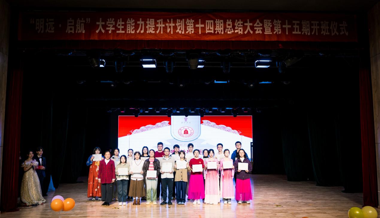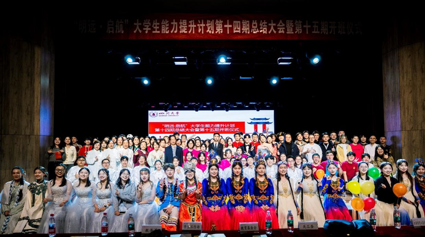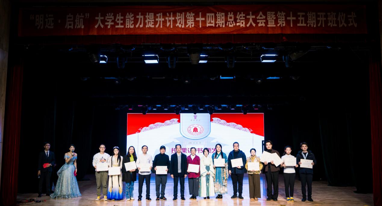 为深化资助育人成效,生动展现资助育人成果,10月24日晚,学工部在江安校区艺术学院小剧场举行了“明远·启航”大学生能力提升计划第十四期总结大会暨第十五期开班仪式。学校相关单位工作负责人、学生教导员、课程教师、企业代表,以及400余名同学齐聚一堂,共赴这场融合非遗文化与美育精神的青春盛会。活动由主持与表达课程学员陈泽萱、张子豪以及从会说到慧说课程学员刘海姣、文志宁主持。