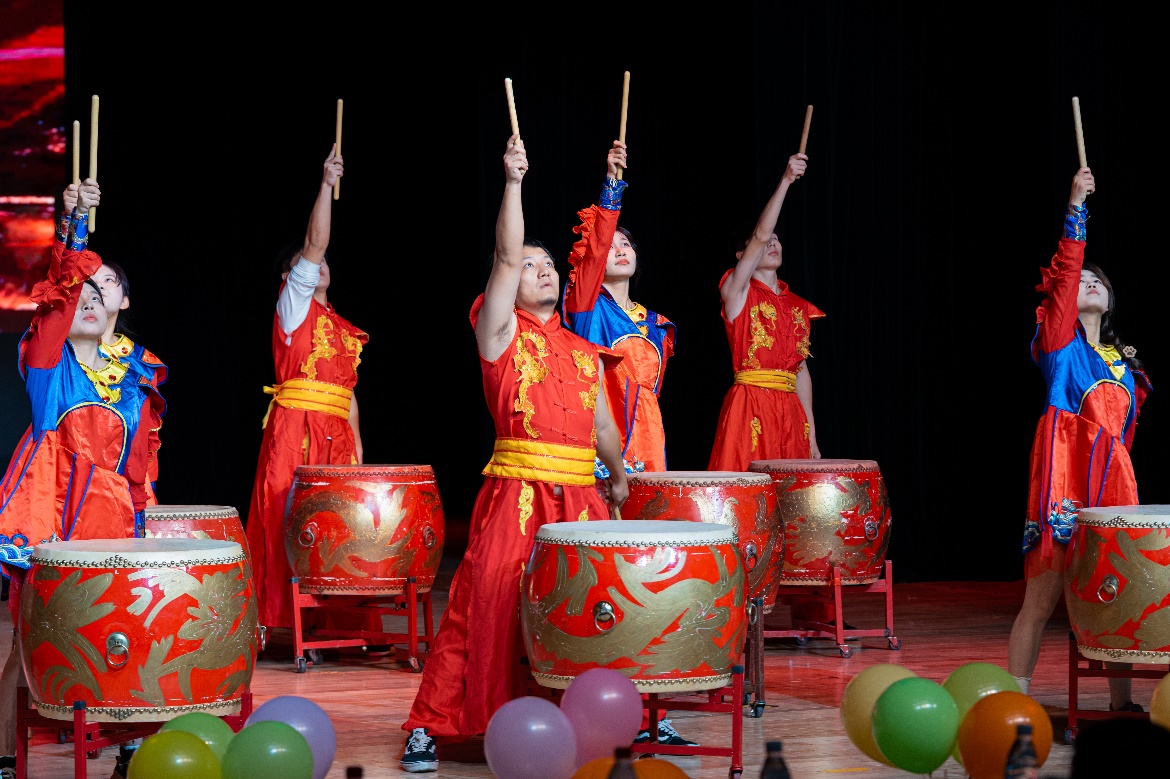 本次汇报展演以“非遗文化与美育融合”为主线,分篇章呈现了一场多元交融、精彩纷呈的艺术盛宴。开篇以《龙狮变,鼓乐天》点燃全场,舞狮的憨劲、川剧变脸的奇幻与狮鼓的激昂交织融合,将非遗技艺的魅力展现得淋漓尽致;随后,刚劲有力的武术表演展现中华武术魂,长嘴壶茶艺演绎东方生活美学,韵味悠长的古典舞尽显东方韵律之美。