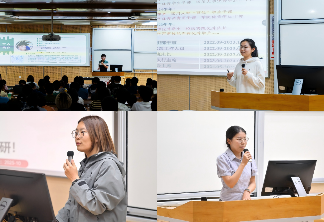 随后的经验分享环节,优秀志愿者代表以自身经历为笔,为低年级同学勾勒成长蓝图。国家奖学金获得者白津城聚焦“学习效能提升”,细致拆解校园平台资源的利用方法,助力学弟学妹快速适应大学学习节奏;2025年度宝钢优秀学生奖得主孙小萌、齐若伶、谢雨桓则分别从“学业与学生工作平衡”“科研入门与进阶路径”“专业必修课学习技巧”三大核心议题切入——孙小萌结合自身时间管理经验提供可落地的方法指引,齐若伶以大创项目与论文发表的时间线为脉络梳理科研流程,谢雨桓则针对课程难点拆解高效学习策略。干货满满的分享,既是优秀学长学姐的“传帮带”,更是川大“勤学善思”学风的生动传递。