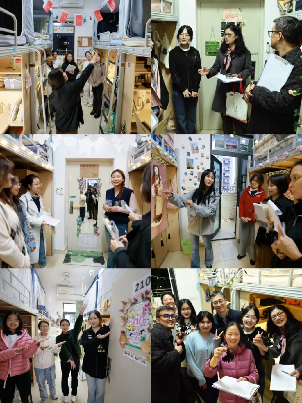 评审环节在评委团共同商讨评分细则、确保公平公正的严谨氛围中开启。评委老师们在方寸寝室间,欣赏多民族共生共融的生动图景:主打温馨、绿色的203寝室跳起了哈萨克族舞蹈,展现全寝“向阳而生”的坚韧;以“爱你我”命名的205寝室挂起了国旗、校旗,用起了“学习任务板”,一起感受“向云端”的美好;410寝室将吉他、唱片与民族乐器结合,以一曲民谣《成都》,展现出同学们的热情;413寝室巧思命名“睡务局”,定制的寝室公约不仅明确卫生、安全、作息规范,字里行间更透着“室友即家人”的默契;408寝室则化身“新疆风情小馆”,特色挂毯、各类干果诉说的是地域文化故事;一名土家族同学主动请教室友、刻苦练习,现场演奏的一曲冬不拉曲目,成为多民族文化互学互赏的鲜活注脚……每一间寝室的展示,都是一次文化的对话;每一个创意的背后,都是一份“同心筑梦”的真诚。