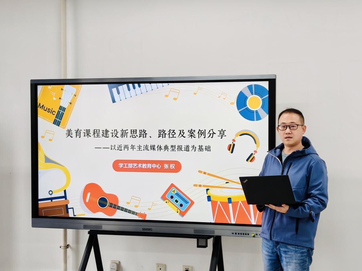 学工部艺术教育中心张权老师首先回顾了“基础知识+审美体验+艺术特长”的传统美育课程建设模式,提出当前美育工作已进入全新阶段,需要注重美育课程、课程美育、活动美育、氛围美育的综合发力,以多种方式弘扬中华美育精神。