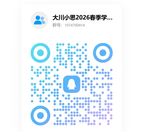 2. 扫码加入QQ群“大川小思2026春季学期招新对外答疑群”,获取招新进度最新通知及答疑渠道,群号:1074700414。