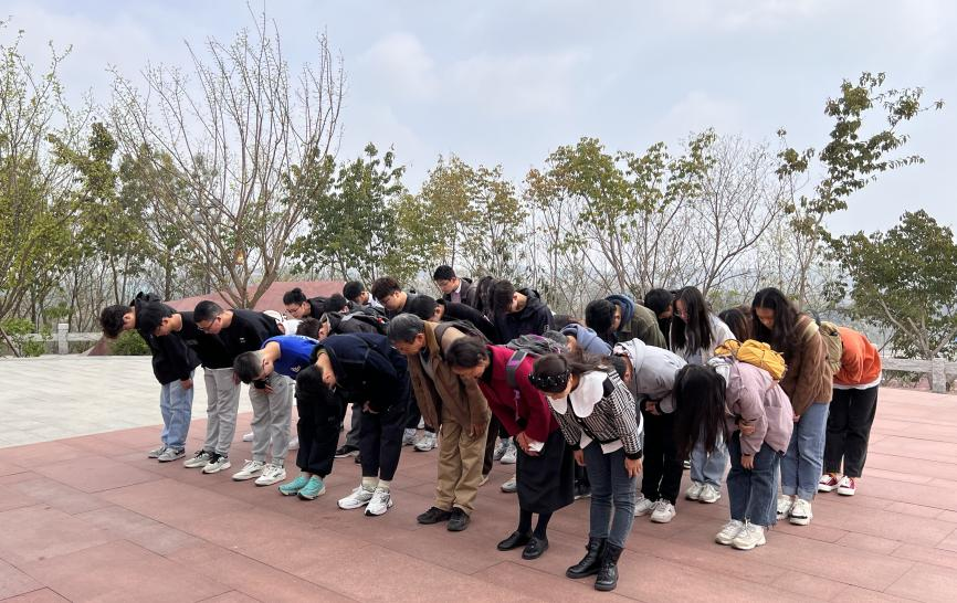 红色研学第三站,师生拾级而上,赴江姐塑像进行献花祭奠活动。江姐塑像高3米,端庄秀美,神采奕奕,微笑着挺立在翠竹寒梅中,生动再现了江姐29岁牺牲时的神韵。学生代表向江姐塑像敬献花圈,师生依次献花并行鞠躬礼,默哀良久,依依不舍。江姐班以及本科社区党支部全体成员,在这片孕育红色基因的土地上,倾听历史回响,接受精神洗礼,以吾辈之名致敬英烈,深情凝望永不褪色的那一抹“红”!