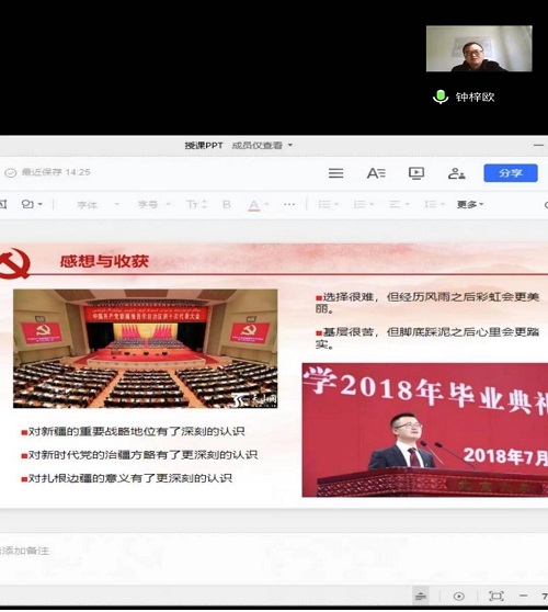 钟梓欧校友从母校本科毕业后即考入北京大学继续攻读硕士学位,其后按照“特殊人才引进”政策到新疆履职。来到祖国边陲,他主动申请到条件艰苦的南疆基层工作,并历任克孜勒苏柯尔克孜自治州阿图什市阿扎克乡副乡长、阿图什市团委书记,以及“西陲第一乡”——乌恰县吉根乡党委书记、阿克陶县皮拉勒乡党委书记等职。在回顾扎根基层的心路历程时,钟校友提到了“全心全意为人民服务”和“理论联系实际”的重要性,认为矢志不渝的初心宗旨和实事求是、密切联系群众的优良作风,是党和国家的事业行稳致远的重要保障。在介绍新时代党的治疆方略具体实践钟校友围绕历次中央新疆工作座谈会精神用“六个抓好”“五个管住”“四个全覆盖”“三个坚决”等关键词,全面介绍了自治区党委落实总目标的所打出的“组合拳”同时还数据直观呈现了近五年来治疆建设所取得的重大成效。在分享来疆工作的收获感悟时,校友着重从边防建设精准扶贫乡村振兴和群团工作四个方面逐一展开讲述,并以自己的人生座右铭“选择很难但经历风雨之后彩虹会更美丽基层很苦但脚底彩泥之后心里会更踏实”与学弟学妹们共勉,号召同学们找准人生方向、坚定理想信念、夯实专业基础、苦练内功本领,勇于实践创新