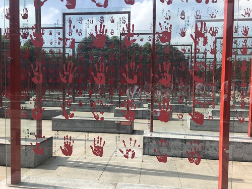 在中国抗战老兵手印广场,支部全体师生在讲解员的带领下有序参观园区。广场上错落有致、赫然排列的钢化玻璃掌印板,无声地诉说着背后那一段不能忘却的、力挽民族危亡勇士们的光辉事迹,令在场的师生们深受震撼。