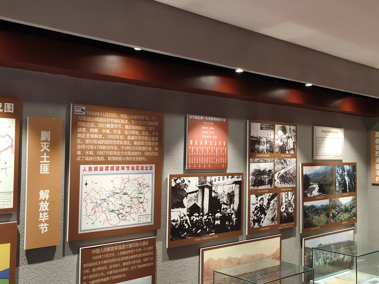 毕节,这座黔西北高原上的红色文化之城,是一个有着光荣历史的革命老区。讲解员依次向大家介绍了革命思想在黔西北地区的传播与毕节地下党组织的建立过程、地下党配合红军开展的革命活动、抗战时期党组织发展及领导的抗日救亡运动、解放战争时期毕节地下党的发展直至最终解放毕节、取得全面胜利的艰苦而又光荣的历程。讲解过程中,大家时而驻足沉思,时而凝视浏览,瞻仰着革命志士在血雨腥风年代创下的丰功伟绩,深切缅怀党在革命历史时期恢宏悲壮、刻骨铭心的峥嵘岁月,对革命先烈为国家发展奉献终身的无私精神和坚定的理想信念充满敬仰。