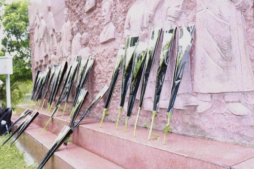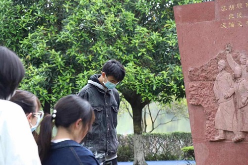 当天下午,同学们在碑前统一深色着装、庄重肃立,向英烈们默哀。接着,大家逐一缓步上前敬献鲜花。活动现场,有同学介绍了2011年学校为纪念辛亥革命100周年而落成的江安英烈碑的设计思路,有同学回顾了以江竹筠、王右木、杨闇公、恽代英、毛英才等为代表的英烈校友的求学、革命事迹。大家为学校悠久的红色历史和光荣的革命传统而倍感自豪,同时也深切体会到“中国共产党百年峥嵘岁月之不易”和“今天的幸福生活来之不易”,表示要学习革命先辈崇高精神,认真践行新时代青年历史使命,扎实专业本领、锤炼品德修为,早日成长为能担当民族复兴大任的时代新人。