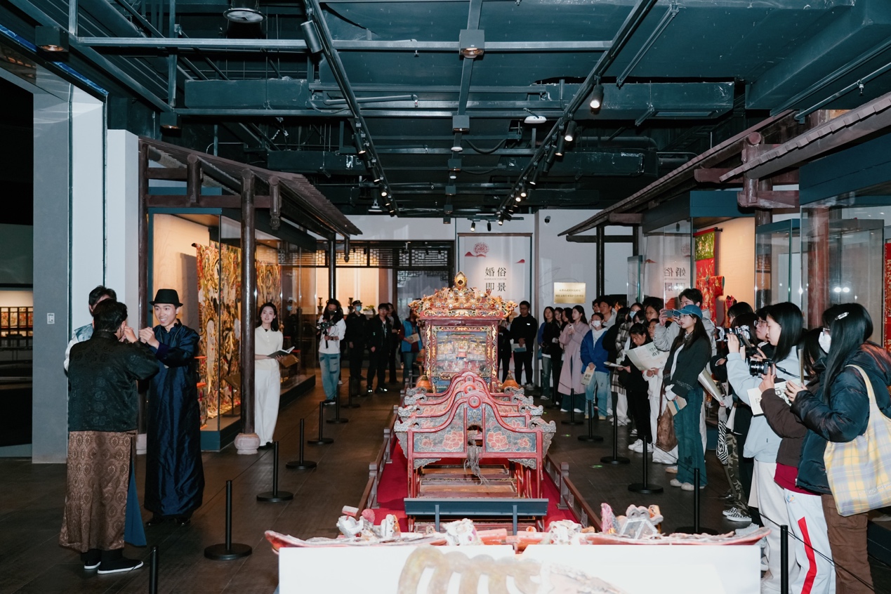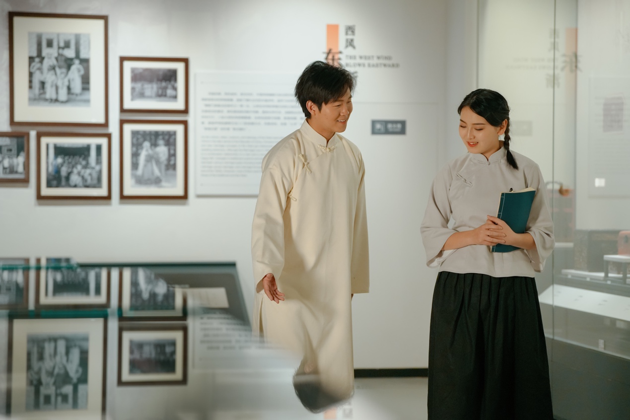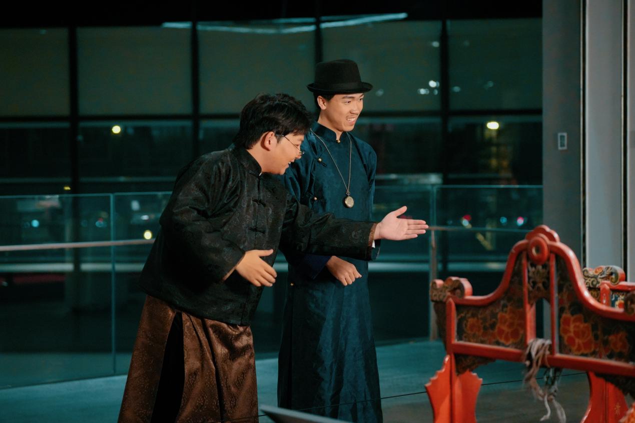 这场别开生面的博物馆沉浸式戏剧导览以“时空旅人”的视角展开。观众跟随文博专业学生“小影”的脚步,追随博物馆前辈学者的收藏目光,穿梭于由文物串联起的成都旧事:冰裂纹梅花窗格前,纨绔少年杨子恒追寻祖训,立志为救亡图存而读书;鸿发轿行的华美花轿旁,兄弟争执折射出新旧思想的激烈碰撞;华西坝上,学风正浓,星空下的露天讲座,男女学生并肩漫谈,交换心事与理想;战火中的婚书,见证着乱世中儿女的勇气和抉择;茶馆里茶牌叮当、茶水飘香,氤氲着老成都的生活智慧;当春乐图戏班曲终,文化的薪火已悄然传递至你我手中……一件件文物如梭,织就了锦城千年文脉;一个个故事如灯,照亮了川人精神底色。此外,现场还特别设置了游戏式答题与观众留言环节,以增进导览的趣味性、参与性、互动性。