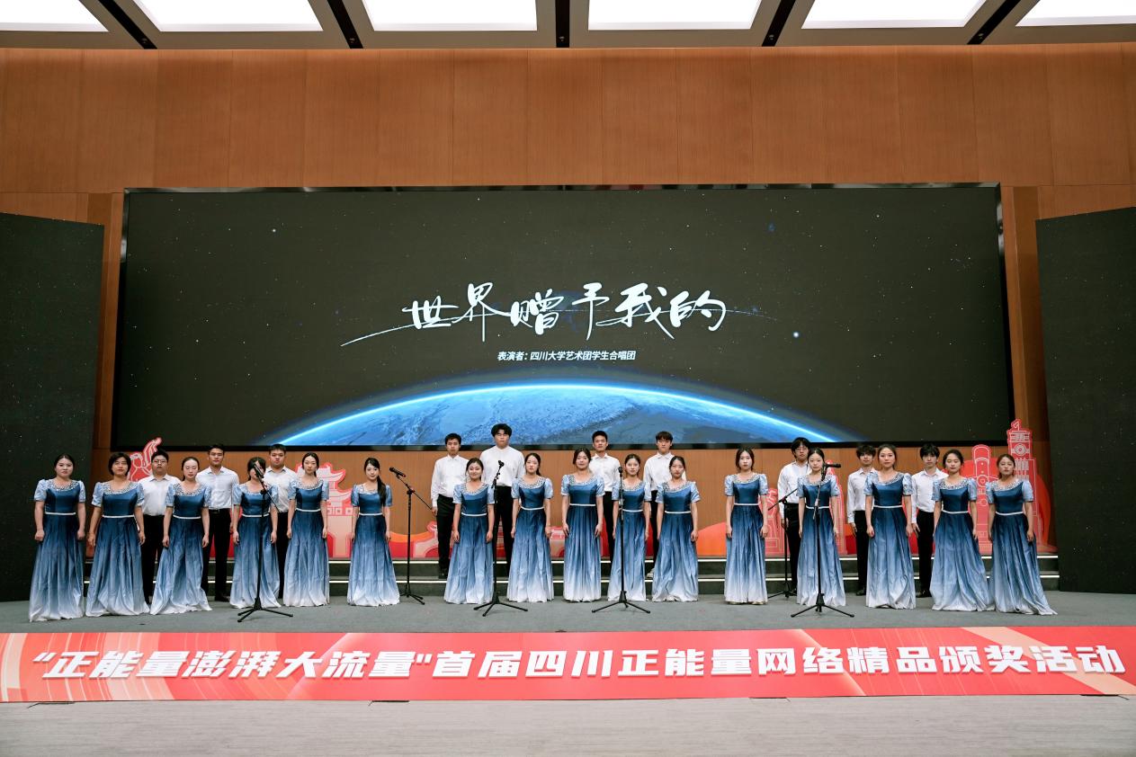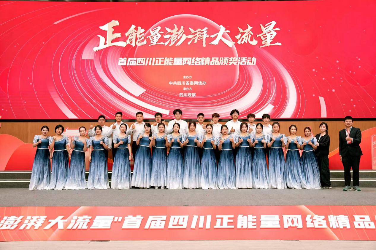4月9日,由四川省委网信办主办、四川观察承办的“正能量澎湃大流量——首届四川正能量网络精品颁奖活动”在四川广播电视台举行。活动旨在表彰积极传播社会主义核心价值观、传递社会正能量的优秀网络作品及创作者,并通过艺术形式进一步扩大活动影响力。我校学生艺术团合唱团受邀登台,以混声四部合唱《世界赠予我的》助力正能量传播。通过音乐艺术赋能正能量传播,合唱团以庄重而温暖的演绎,为现场营造出鼓舞人心的氛围。