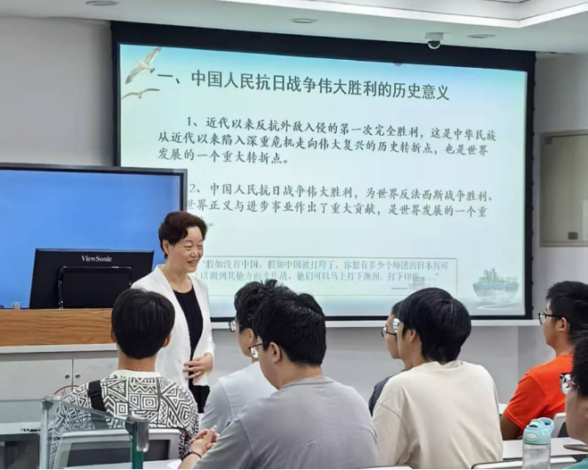陈文泽教授以中国人民抗日战争胜利的历史意义为切入点,阐明了这是近代中国反抗外敌入侵的首次完全胜利,是民族复兴的转折点,也为世界反法西斯战争胜利作出了重要贡献。她引用罗斯福的论述,详细为同学们剖析中国抗日战争在世界反法西斯战争中的独特地位和作用。随后,陈教授围绕 “中国共产党是抗战胜利的中流砥柱” 展开讲解。她结合毛泽东同志的论断,从五个维度梳理了中国共产党的作用,并引用日方史料加以印证,强调中国共产党为抗战胜利提供了坚强领导和有力支撑