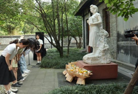 活动伊始,江姐班学生代表向江姐塑像敬献鲜花、鞠躬致敬。