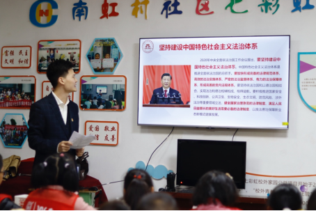 宣讲员王宇轩同学首先从习近平法治思想的提出背景、地位意义、体系构成入手,重点讲解了“法”的概念和“坚持建设中国特色社会主义法治体系”的内涵外延,并就“你知道生活中都有哪些法律”与现场青少年开展了互动交流。