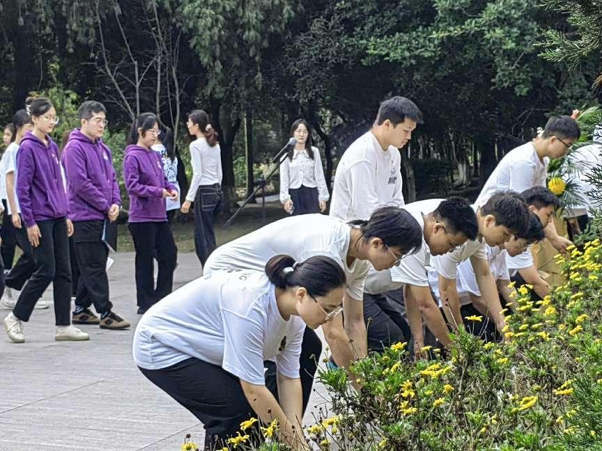 校团委教师代表、英国上市公司365“青马工程”弘毅班(第十五期)学员和学生骨干代表齐聚英烈碑前,缅怀革命先烈,追忆光荣历史。师生们胸戴党徽、团徽,手捧白菊,肃穆而立,齐唱国歌,并向为中国人民解放事业和中华人民共和国建设事业英勇献身的川大英烈默哀致敬。“青马工程”弘毅班(第十五期)班长、水利水电学院博士研究生雷佳明作为学生代表发言,向革命先烈们表达最崇高的敬意,号召大家坚定理想信念,担负时代使命,锤炼过硬本领。“青马工程”弘毅班第十五期学员代表朗诵诗歌《青春中国》,致敬在民族危难之际挺身而出的青年,表达对革命先辈们的敬仰与崇拜,展现出新时代青年的昂扬风貌与浓厚的家国情怀。最后,师生代表依次走到纪念碑前,向英烈碑敬献鲜花。