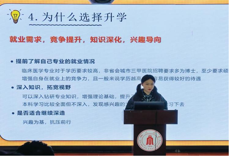 升学深造是同学们未来规划的选项之一,明确方向和科学规划尤为重要。升学组的欧桐彤、秦骁桐、蒋佳琳、徐柯四位小导师分别就保研和留学进行了经验分享。他们重点就保研/留学的要求及相应的学业规划进行了讲解。小导师们认为,无论是保研还是留学,课程成绩和英语水平是最重要的基础“硬实力”,而科研、竞赛及实习是锦上添花的“软实力”,综合素养则是体现能力风格的“个人特色”。针对如何达成未来的升学目标,小导师们提出了相应的从大一到大四各阶段的学业规划建议,助力同学们在正确的方向上前行。