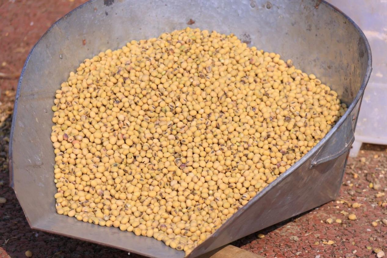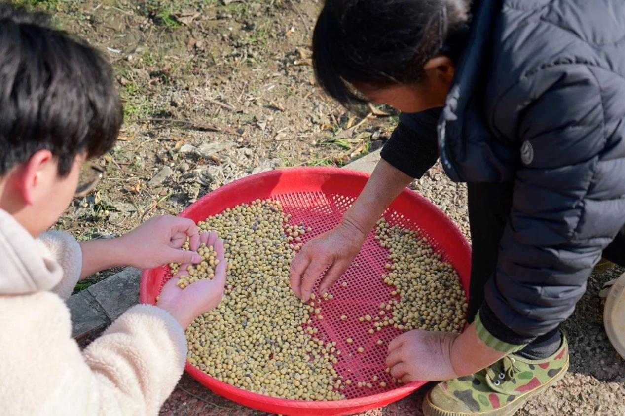 同学们俯下身,手握链枷或木棍,有节奏地捶打豆荚。随着链枷的一起一落,一粒粒黄豆“砰砰砰”地蹦出来。经过脱粒、过筛、去杂,黄灿灿的“金豆”颗粒归仓。